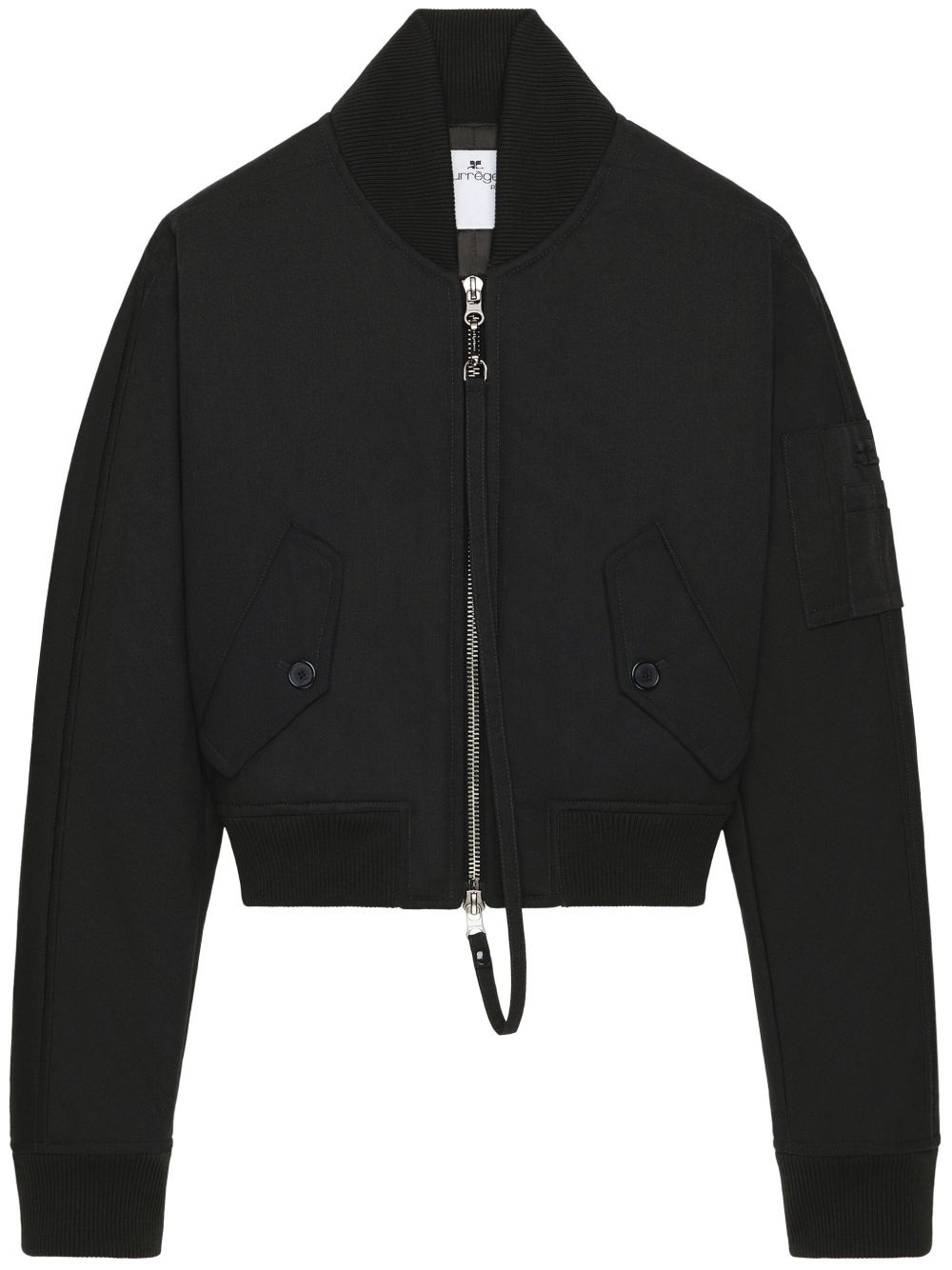 cropped bomber jacket Highlights - Black - Front two-way zip fastening - Ribbed cuffs and hem - Two button-fastening pockets - Sleeve patch pocket Imported Composition Polyester 65%, Cotton 35%