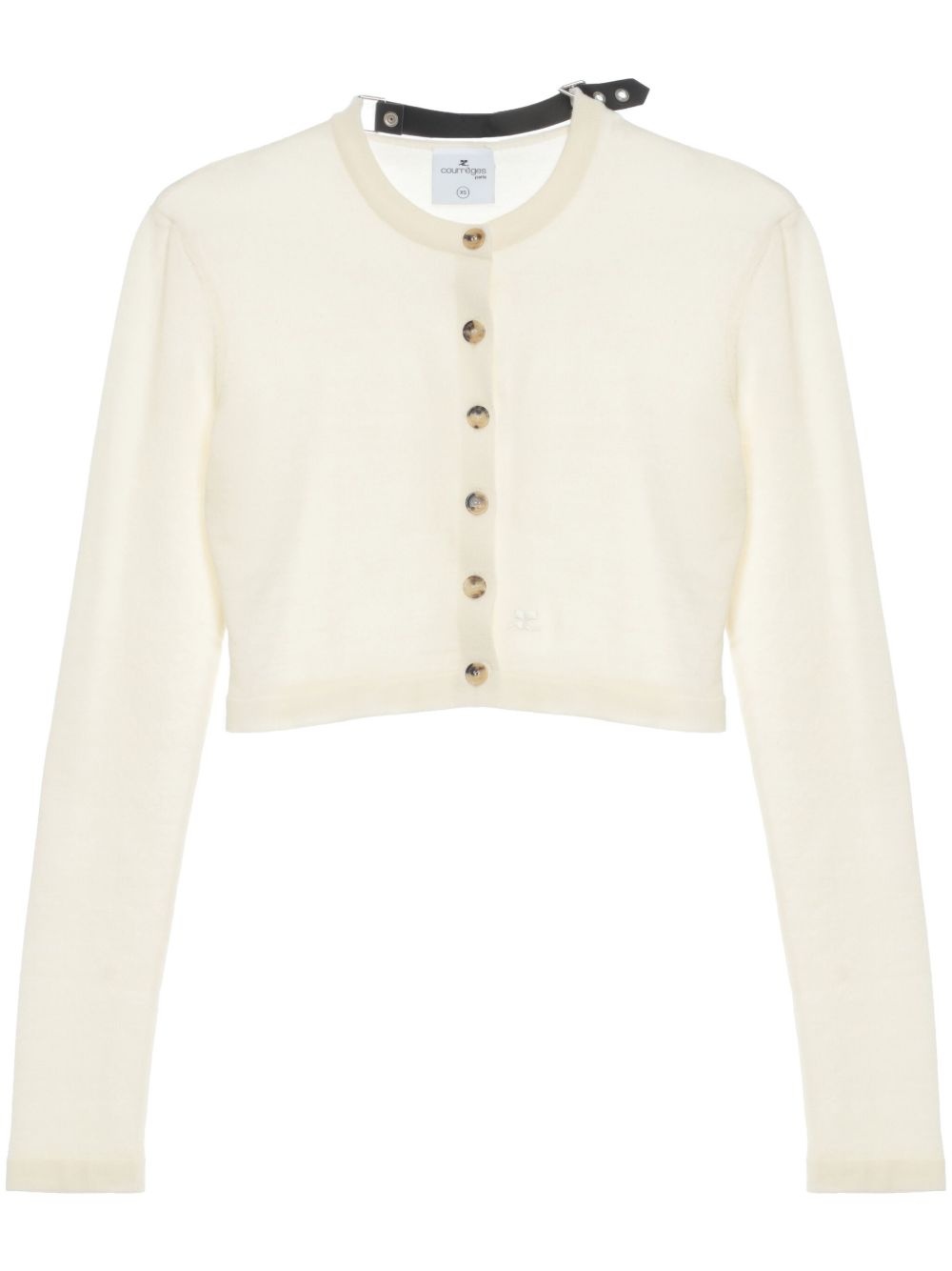 cropped fine-knit cardigan Highlights - White - Cotton-wool blend - Fine knit - Round neck - Buckle fastening strap to the rear - Front button fastening - Long sleeves - Straight hem - Cropped Made in Italy Composition Cotton 54%, Wool 44%, Polyamide 2% SIZE & FIT FittingInformation Designed for a slim fit that sits just away from the body offering a close yet comfortable fit Made with a lightweight knit, this piece offers some stretch Washing instructions Read Manufacturer Guidelines