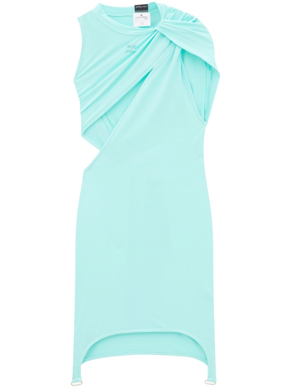 cut-out gathered mini dress turquoise blue-green embroidered logo to the front gathered detailing cut-out detailing round neck sleeveless straight hem thigh-length Made in France Composition Polyamide 78%, Elastane 22%