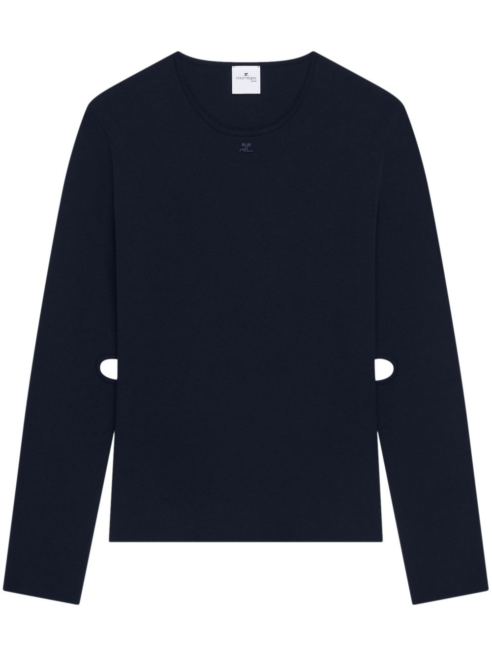 cut-out knit sweater Highlights - Navy blue - Cut-out detailing - Round neck - Applique logo - Long sleeves Imported Composition Viscose 70%, Polyester 30%