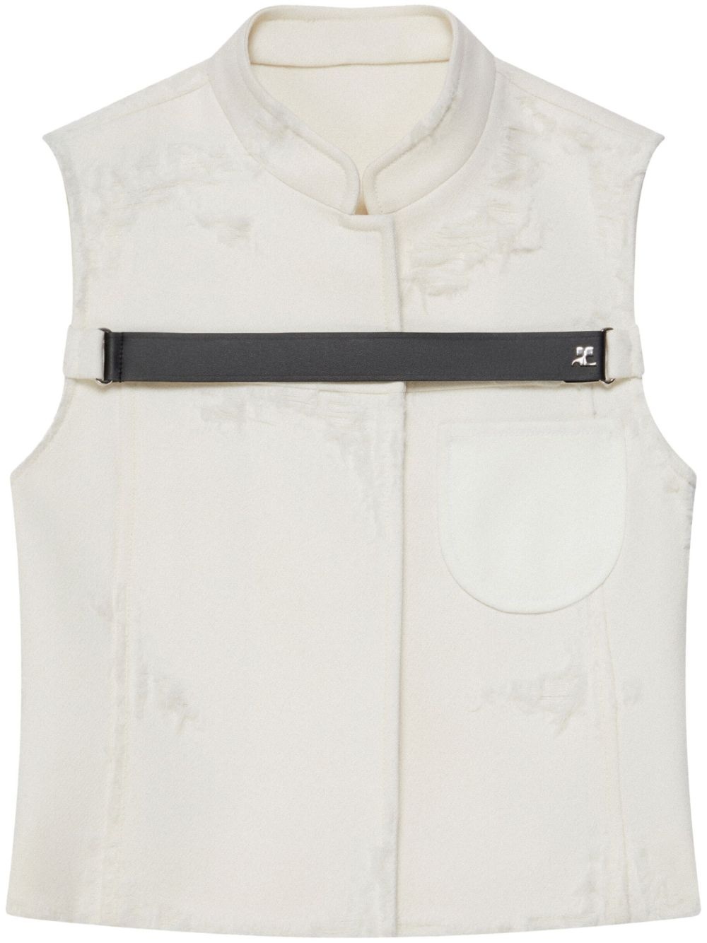 distressed strap racer jacket Highlights - Ivory white - Wool/cotton - Distressed effect - Logo plaque - Strap detailing - Stand-up collar - Sleeveless - Front patch pocket - Straight hem Made in France Composition Cotton 100%, Wool 100% Washing instructions Read Manufacturer Guidelines