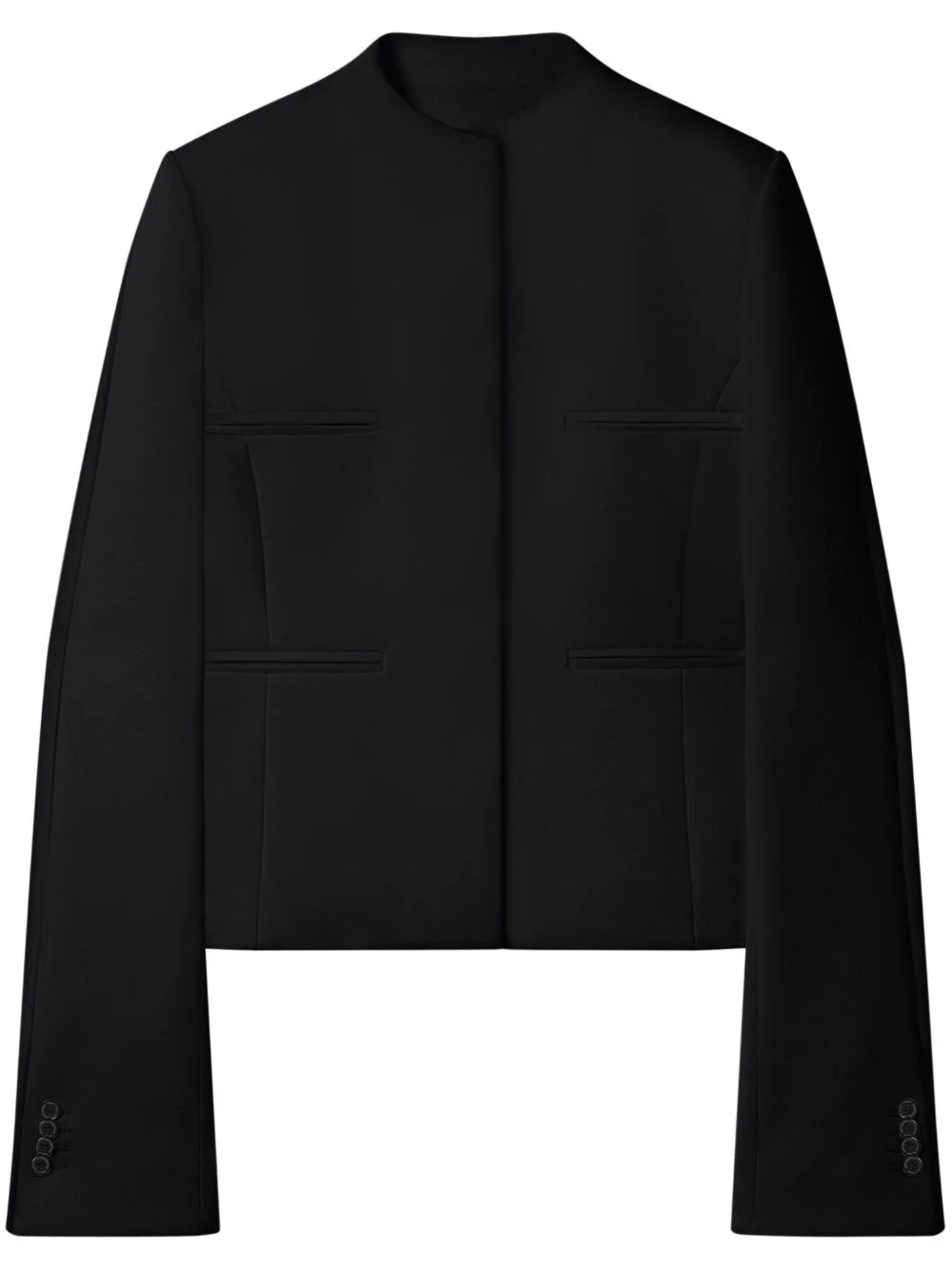 Heritage concealed-fastening crepe jacket Highlights - Black - Crepe texture - Applique logo - Round neck - Concealed front fastening - Long flared sleeves - Buttoned cuffs - Front welt pockets Imported Composition Polyester 100%