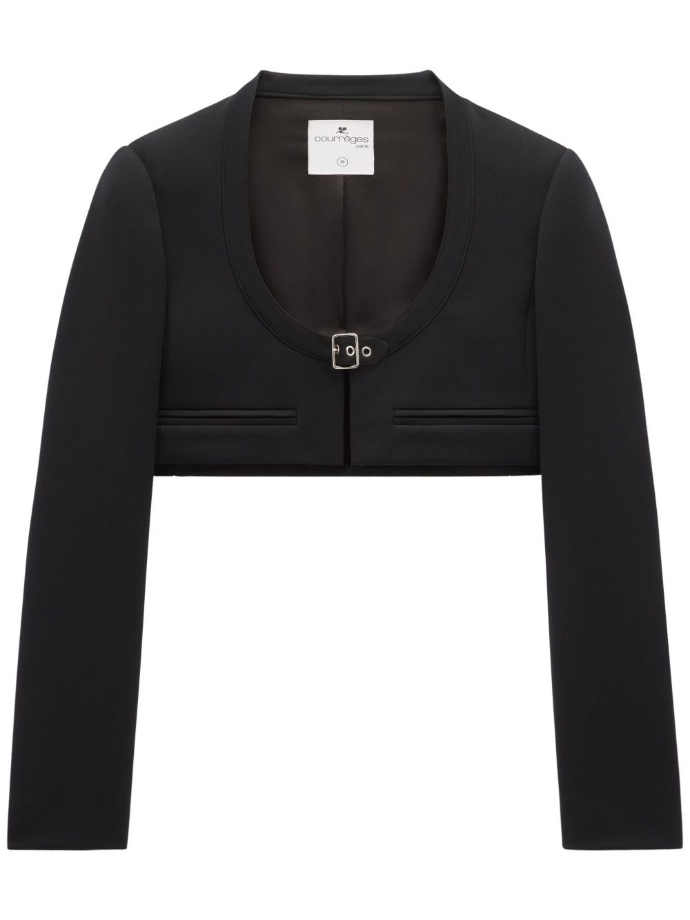 Holistic jacket Highlights - Black - Twill weave - Front buckle fastening - Collarless - Scoop neck - Two front welt pockets - Long sleeves - Cropped - Straight hem Imported Composition Polyester 83%, Acetate 17% Washing instructions Read Manufacturer Guidelines