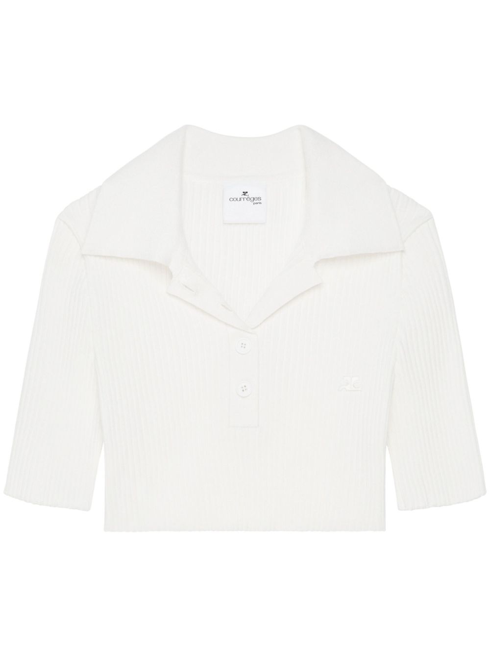 knitted cropped polo top Highlights - White - Front button placket - Camp collar - Short sleeves - Applique logo Imported Composition Viscose 70%, Polyester 30%