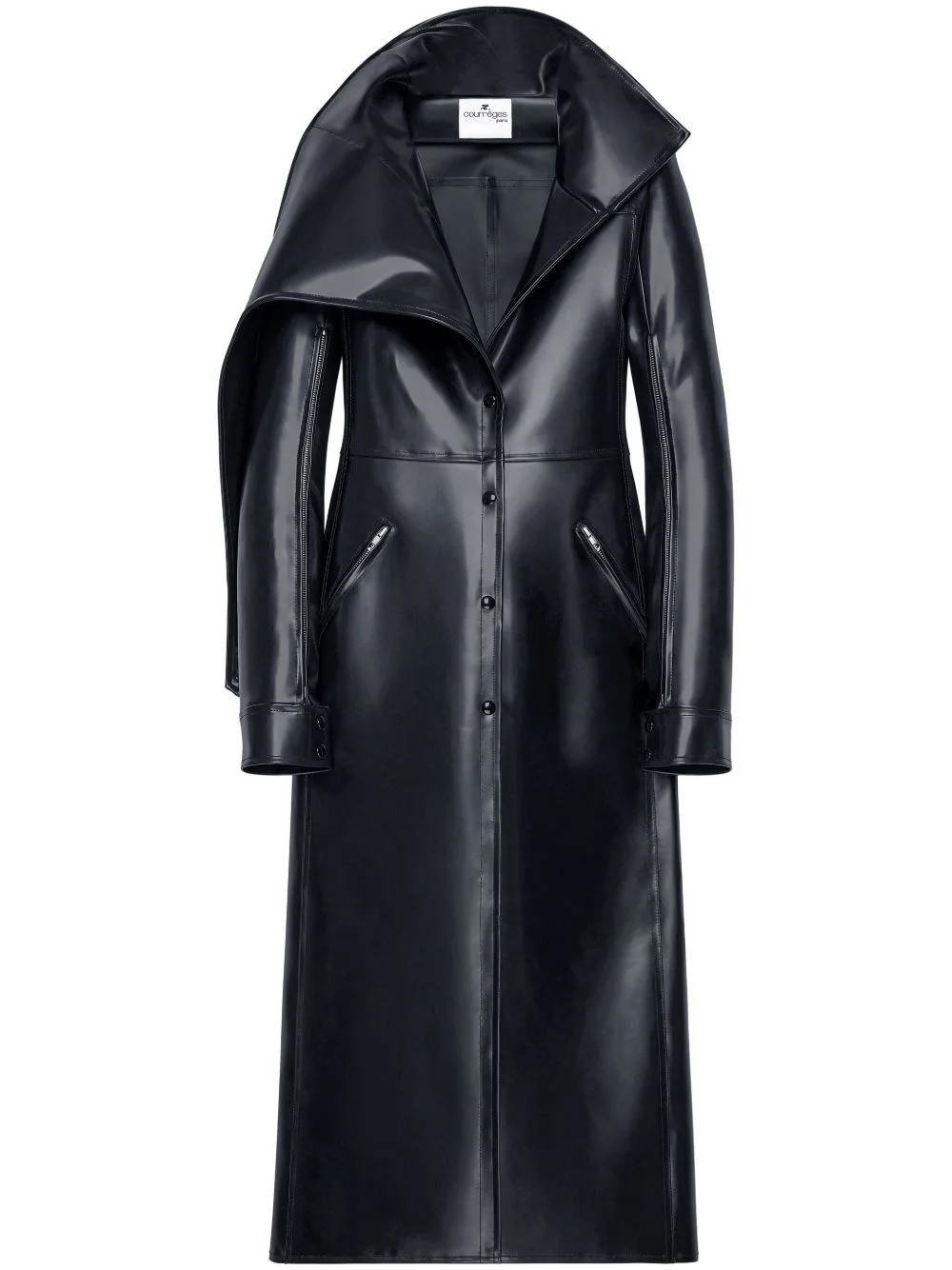 latex button-up trench coat Highlights - Black - Large adjustable collar - Front button fastening - Belt fastening - Long zipped sleeves - Two side zip-fastening pockets - Rear slit - Straight hem Imported Composition Polyvinyl Butyral 97%, Polyurethane 3% Washing instructions Read Manufacturer Guidelines