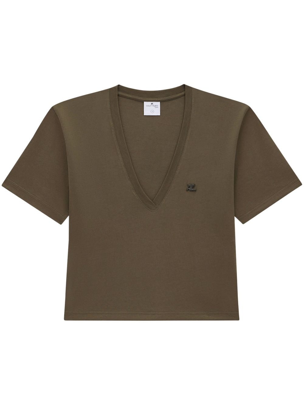 logo-applique cropped T-shirt This Courreges T-shirt is defined by its V-neck and cropped length. It's spun from a green cotton jersey and adorned with the brand's signature AC logo embroidered on the chest. Highlights - Olive green - Cotton - Applique logo - V-neck - Short sleeves - Straight hem - Cropped Imported Composition Cotton 100% Washing instructions Read Manufacturer Guidelines