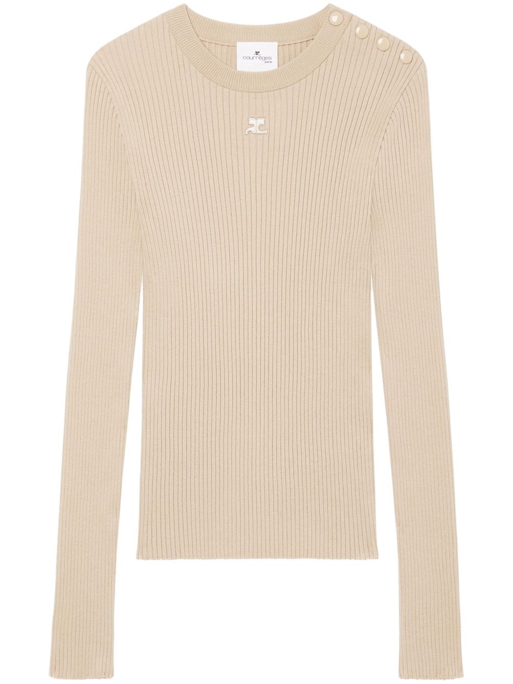 logo-embroidered ribbed jumper Highlights - Sand beige - Ribbed knit - Embroidered logo to the front - Round neck - Button fastening at the shoulder - Long sleeves - Straight hem Imported Composition Viscose 70%, Polyester 30% Washing instructions Read Manufacturer Guidelines