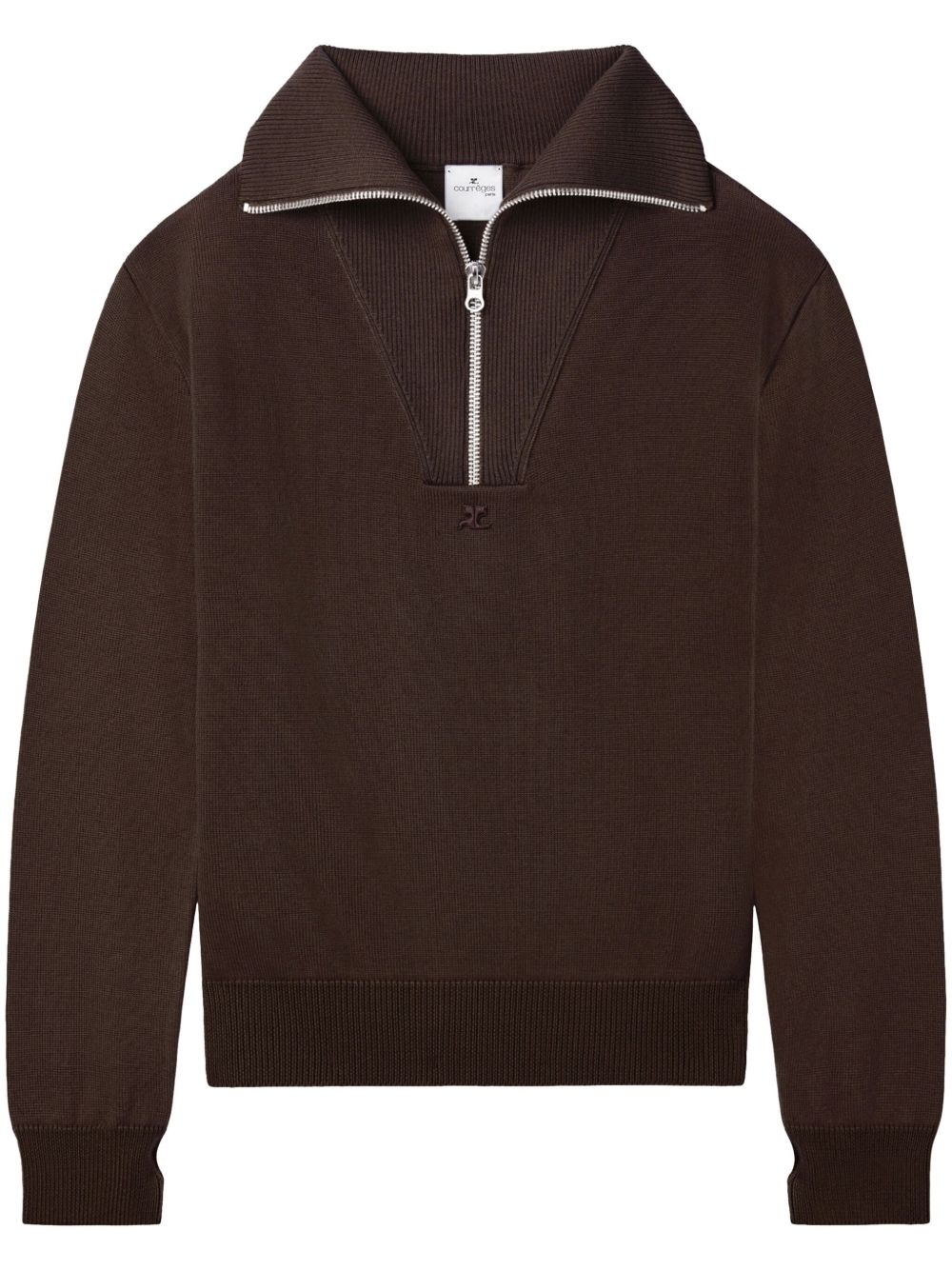 logo-embroidered wool sweater Highlights - Coffee brown - Wool - Knitted construction - Embroidered logo to the front - Ribbed collar - Short front zip fastening - Long sleeves - Ribbed cuffs and hem - Straight hem - When buying this unisex item, keep in mind that it is graded in standard men's sizing. Imported Composition Wool 100% SIZE & FIT FittingInformation Designed for a relaxed fit, this piece allows for comfort and movement when worn The ribbed hem offers a close, comfortable fit Made with a midweight knit, this piece offers some stretch