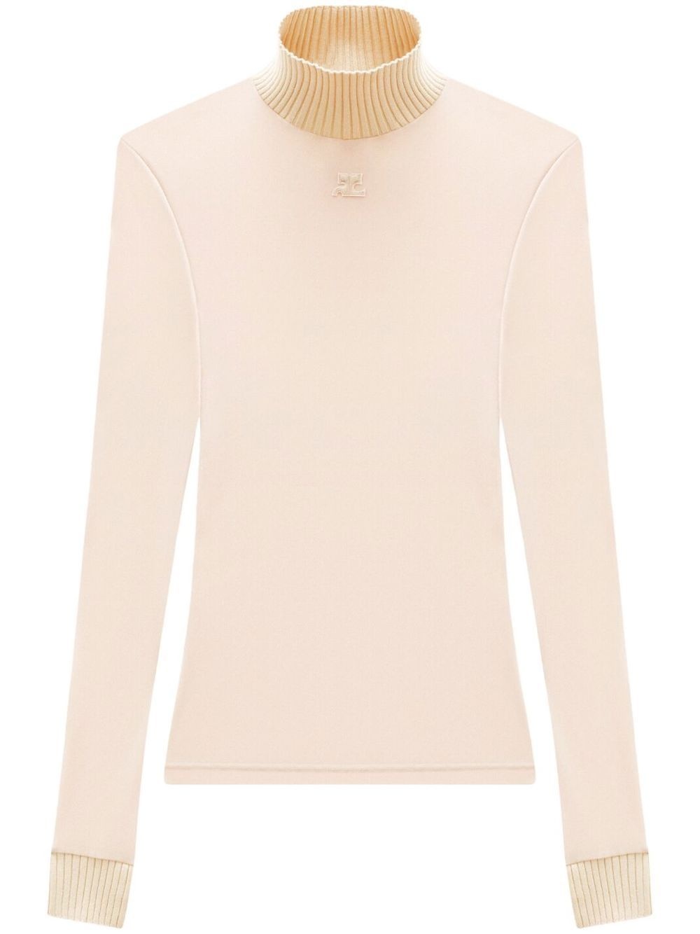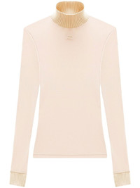logo high-neck knitted top sand beige knitted construction ribbed trim logo patch to the front high neck long sleeves straight hem Imported Composition Outer: Polyester 100%