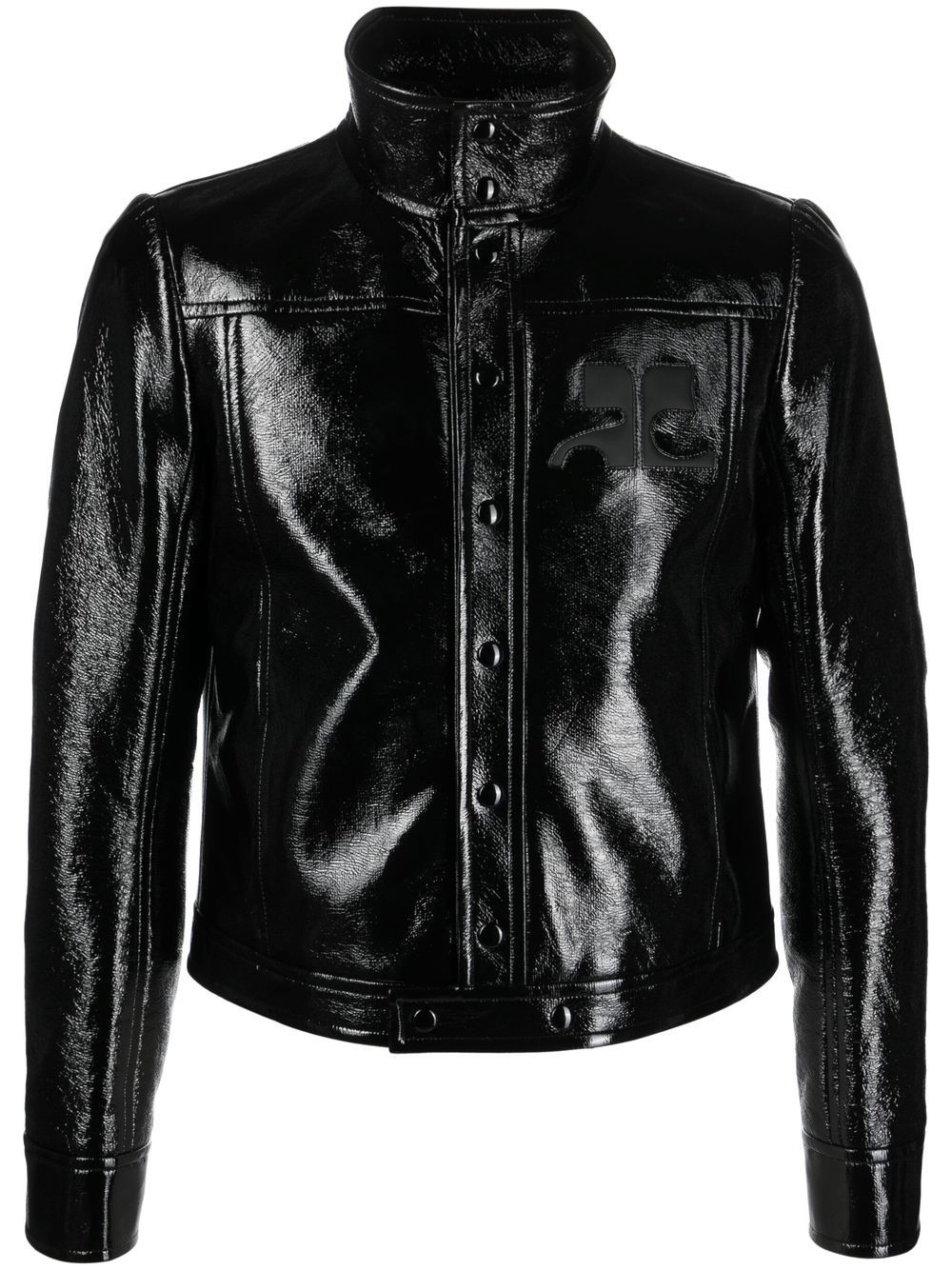 logo-patch faux leather jacket jet black cotton blend high-shine finish logo patch to the front funnel neck front press-stud fastening long sleeves Imported Composition Outer: Cotton 88%, Polyurethane 10%, Spandex/Elastane 2% Lining: Cupro 100% SIZE & FIT Model measurements Height 6 ft 2 in(1.87 m) Bust/Chest 38.18 in(97 cm) Hips 36.61 in(93 cm) Waist 29.13 in(74 cm) FittingInformation This piece fits small – you might want to get one size up Cut for a slim fit Made with a mid-weight fabric Washing instructions Dry Clean Only