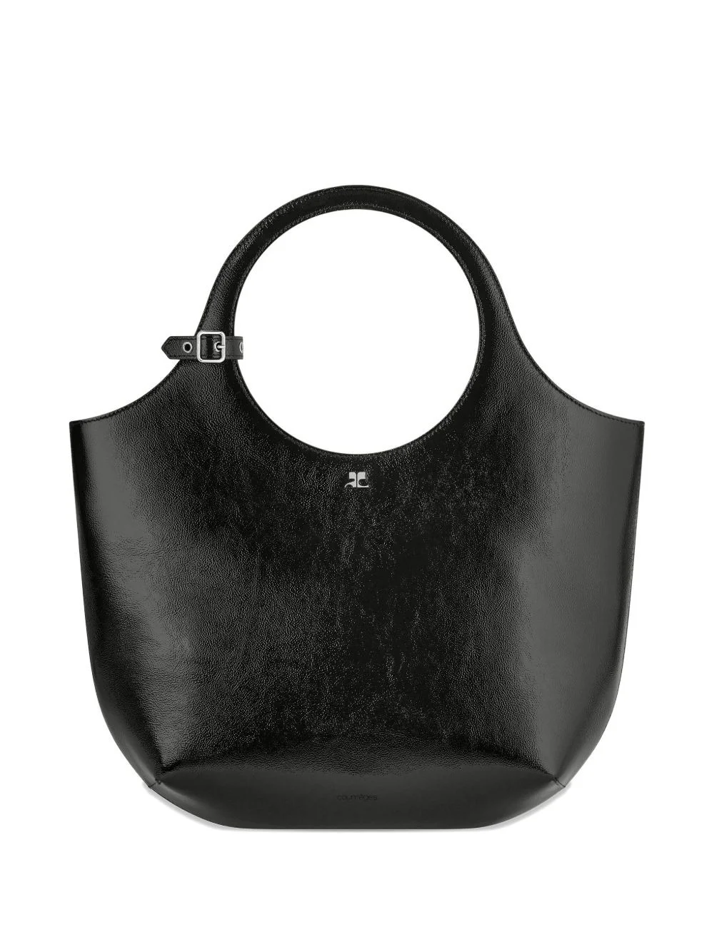 medium Holy circular-handle leather tote bag Highlights - Black - Top-grain bovine leather - Circular handle - Buckle fastening - Embossed logo - Internal zip pocket Made in Italy Composition Bovine Leather (top grain) 100% SIZE & FIT Measurement HEIGHT 17.71 in(45 cm) WIDTH 14.96 in(38 cm)