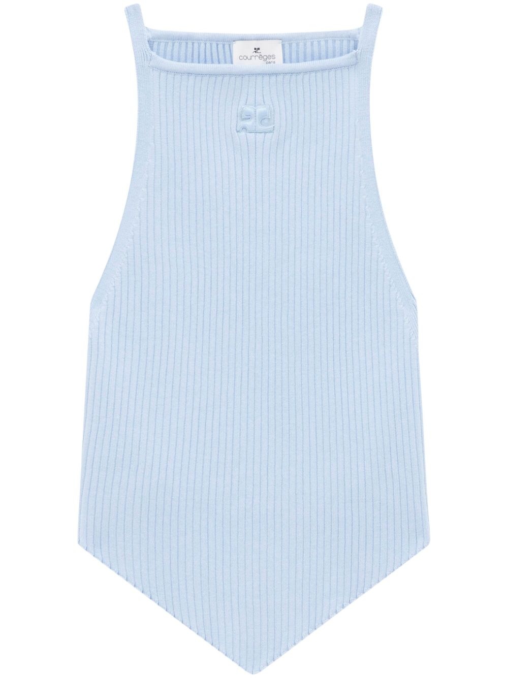 Pointy rib-knit tank top Highlights - Sky blue - Ribbed knit - Logo patch to the front - Crew neck - Spaghetti straps - Cropped Imported Composition Viscose 70%, Polyester 30%