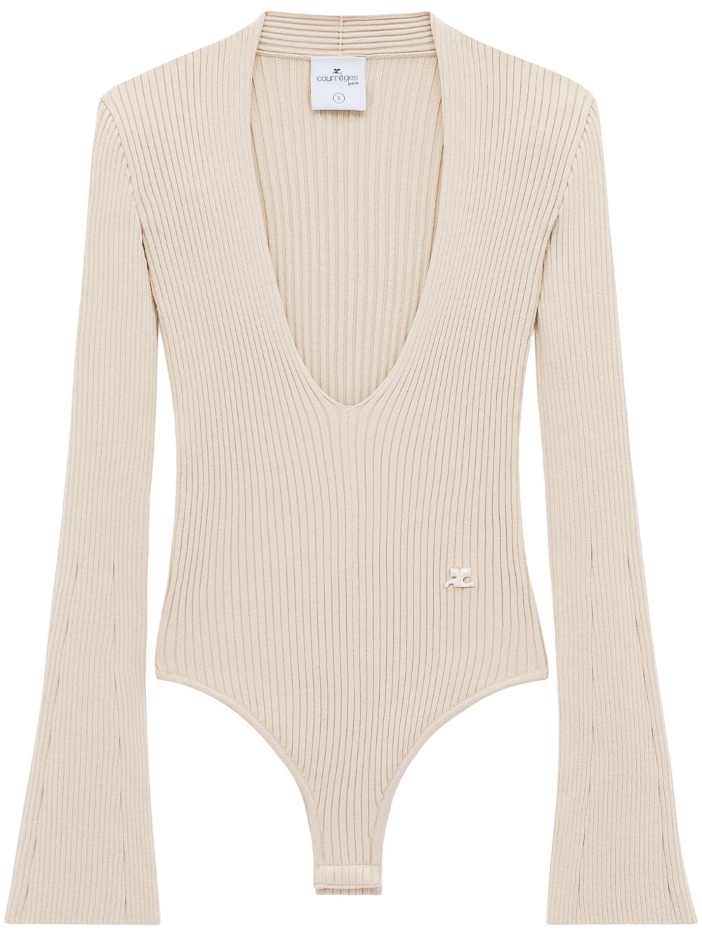 ribbed-knit bodysuit Crafted to a ribbed-knit, this ecru Courreges bodysuit features a plunging V-neck. Flared sleeves lend a retro-inspired touch, while a logo applique to the front adds a branded note. Highlights - Ecru - Ribbed knit - Applique logo - Plunging v-neck - Long sleeves - Flared cuffs - Just a reminder that this piece must be tried on over your own garments. Imported Composition Viscose 70%, Polyester 30% Washing instructions Read Manufacturer Guidelines