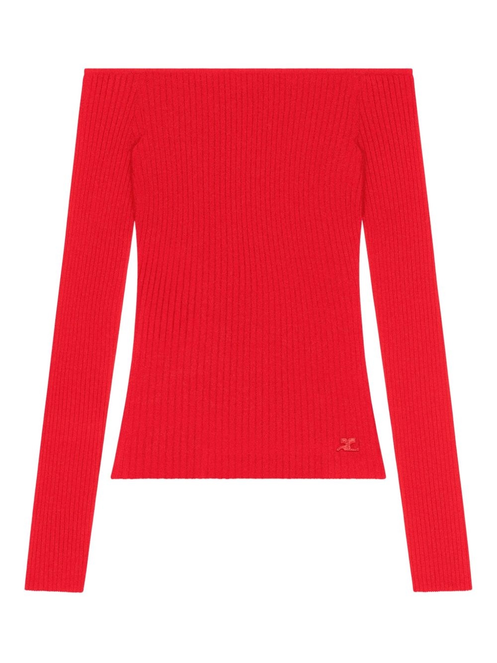 ribbed off-shoulder top Highlights - Red - Long sleeves - Logo detail at hem - Off-shoulder neckline Imported Composition Viscose 70%, Polyester 30%