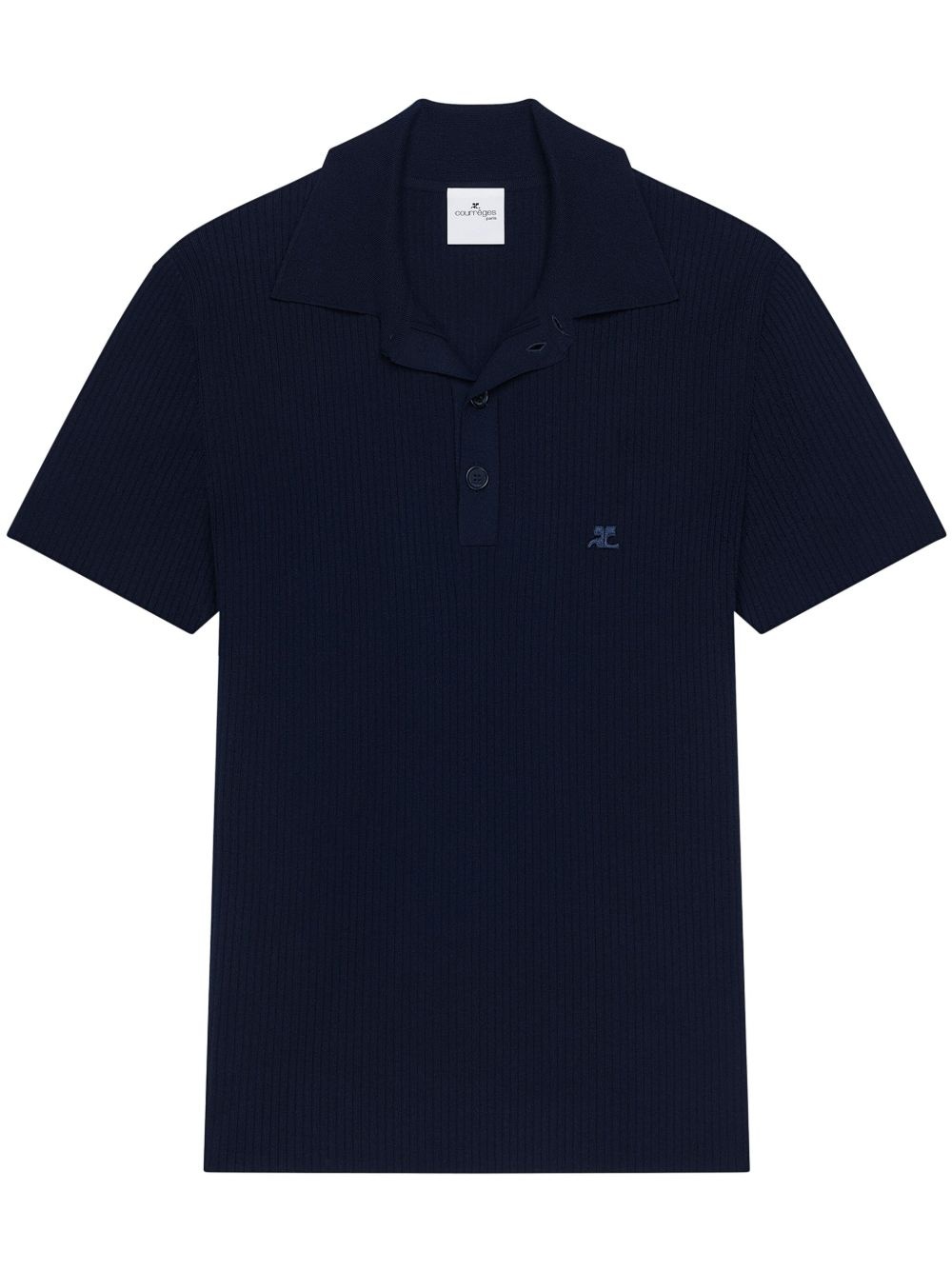 ribbed polo shirt Highlights - Navy blue - Front button placket - Embroidered logo at the chest - Camp collar - Short sleeves Imported Composition Viscose 70%, Polyester 30%