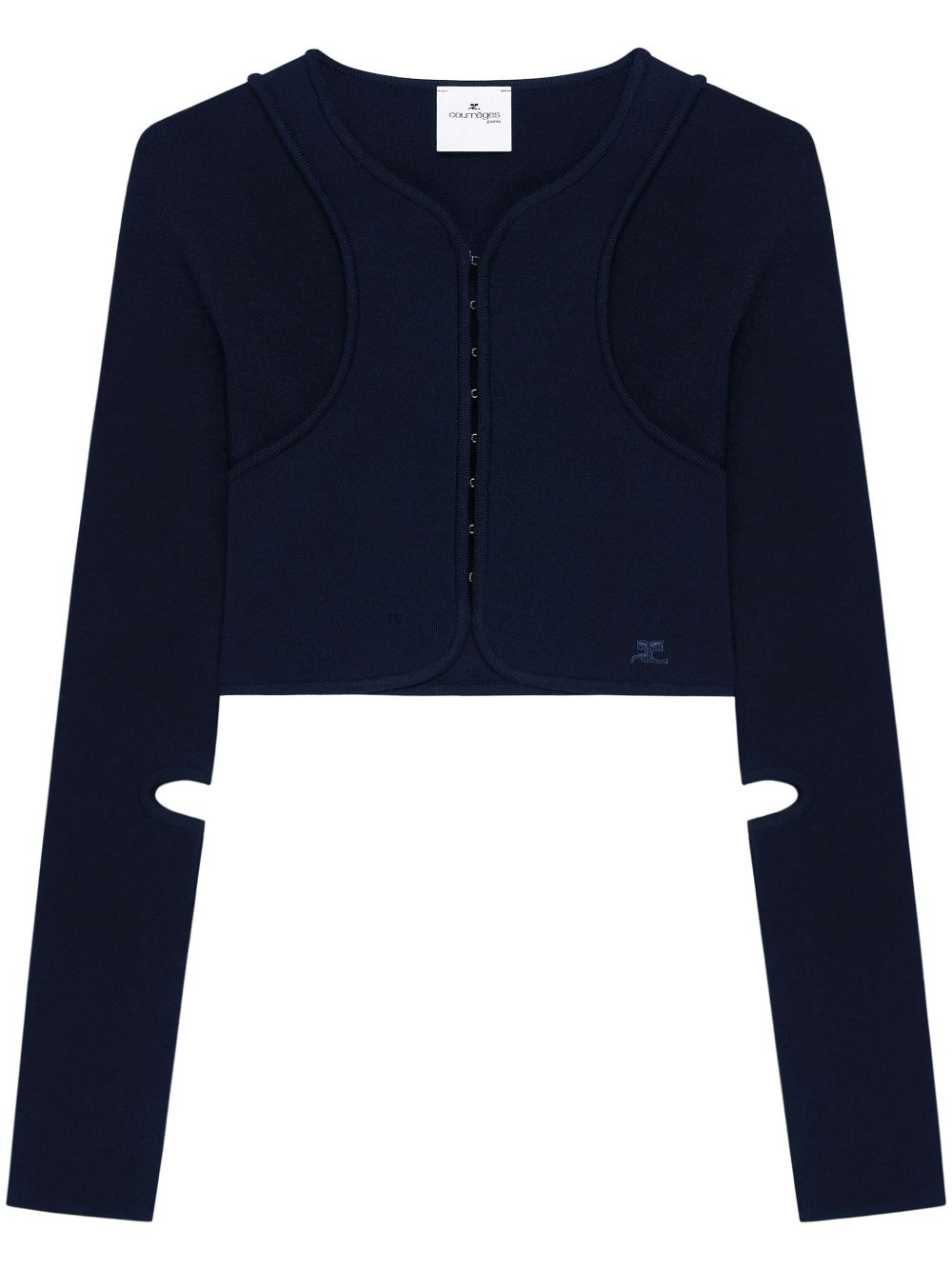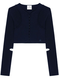 scuba cardigan Highlights - Navy blue - Front hook and eye fastening - Cut-out detailing - Embroidered logo to the side - Seam detailing Imported Composition Viscose 70%, Polyester 30%