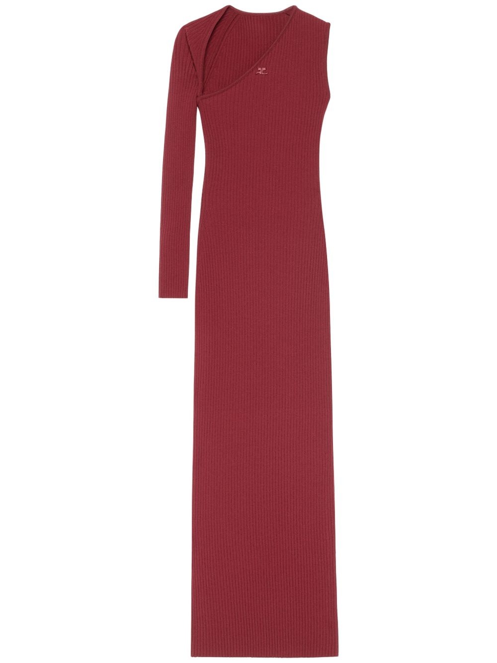 slash ribbed knit dress Highlights - Red - Ribbed knit - Applique logo - Asymmetric neck - Single long sleeve - Mid-length - Straight hem Made in Italy Composition Viscose 70%, Polyester 30%