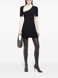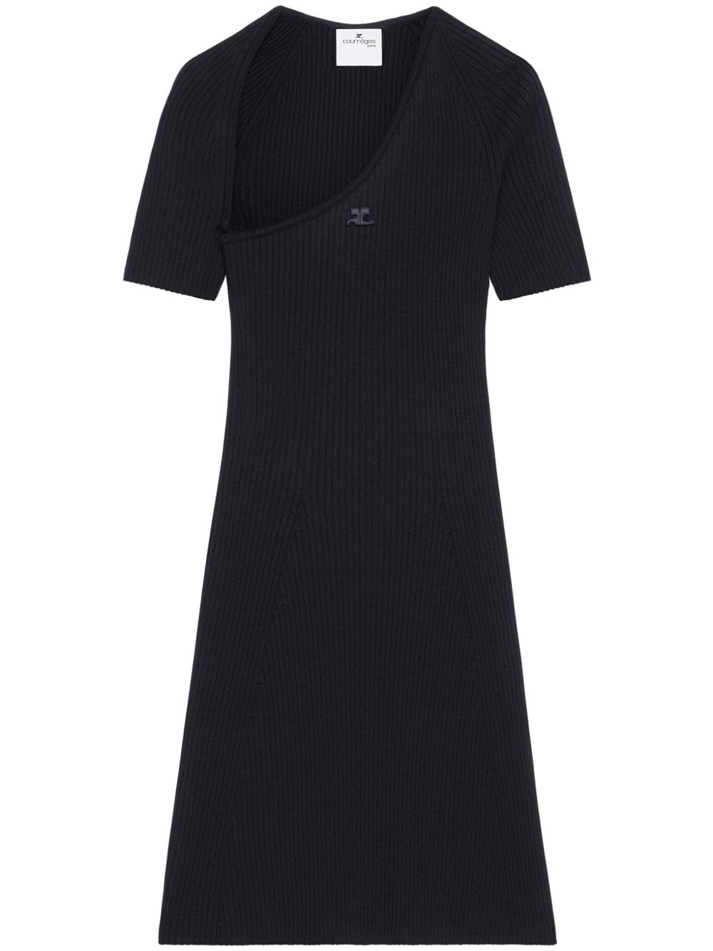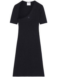 slash ribbed knit dress Highlights - Black - Ribbed knit - Applique logo - Asymmetric neck - Short sleeves - Thigh-length - Straight hem Made in Italy Composition Viscose 70%, Polyester 30%