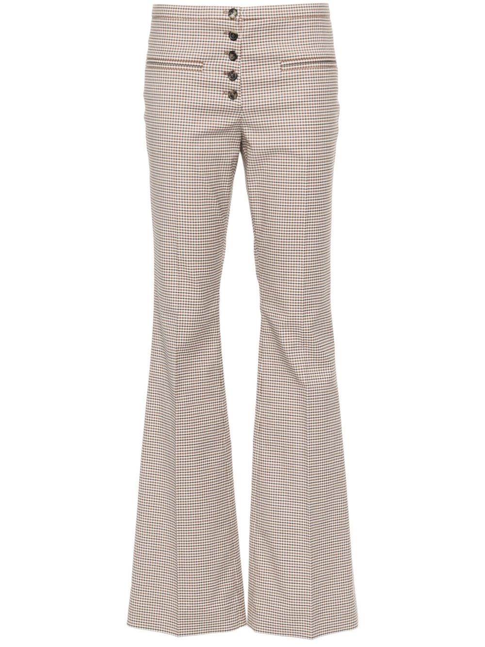 tailored checked trousers Highlights - Brown/white - Wool-cotton blend - Check pattern - Tailored design - Flared design - Two front jetted pockets - Pressed crease - Rear jetted pocket - Front button fastening Imported Composition Outer: Wool 52%, Cotton 45%, Spandex/Elastane 3% Lining: Cupro 100% SIZE & FIT Model measurements Height 5 ft 10 in(1.78 m) Bust/Chest 33.07 in(84 cm) Hips 36.61 in(93 cm) Waist 24.8 in(63 cm) FittingInformation Designed with a flared hem, these trousers allow for a close fit at the waist with a slim fit over the leg and widening towards the hem Made from a midweight stretch fabric, this piece offers elasticity and flexibility when worn This piece fits true to size – take your usual size Washing instructions Dry Clean Only