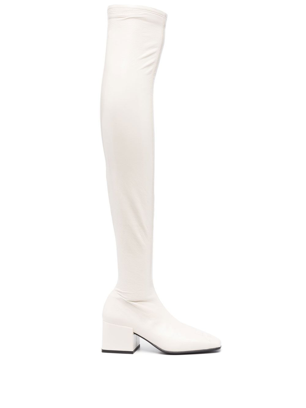 thigh-high boots bone white calf leather square toe side zip fastening thigh-high low block heel Made in Italy Composition Outer: Polyester 100% Lining: Fabric 100%, Calf Leather 100% Sole: Calf Leather 100% SIZE & FIT Measurement HEIGHT 25.59 in(65 cm) PLATFORM 2.36 in(6 cm)