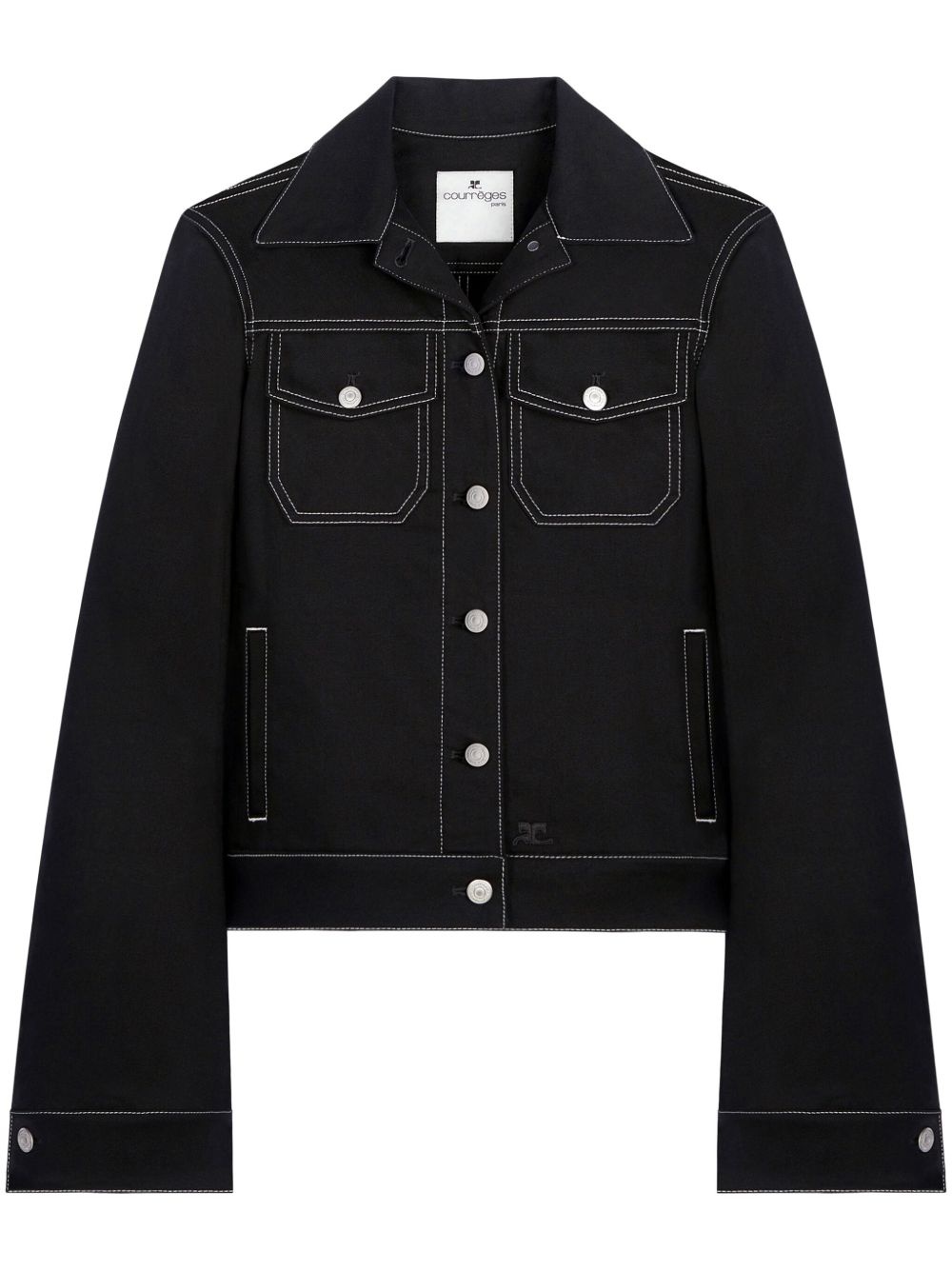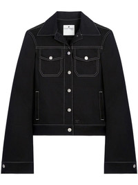 topstitched denim trucker jacket Highlights - Black - Cotton blend - Contrast stitching - Classic collar - Front button fastening - Two button-fastening chest pockets - Two side welt pockets - Long sleeves - Straight hem Imported Composition Cotton 98%, Elastane 2%