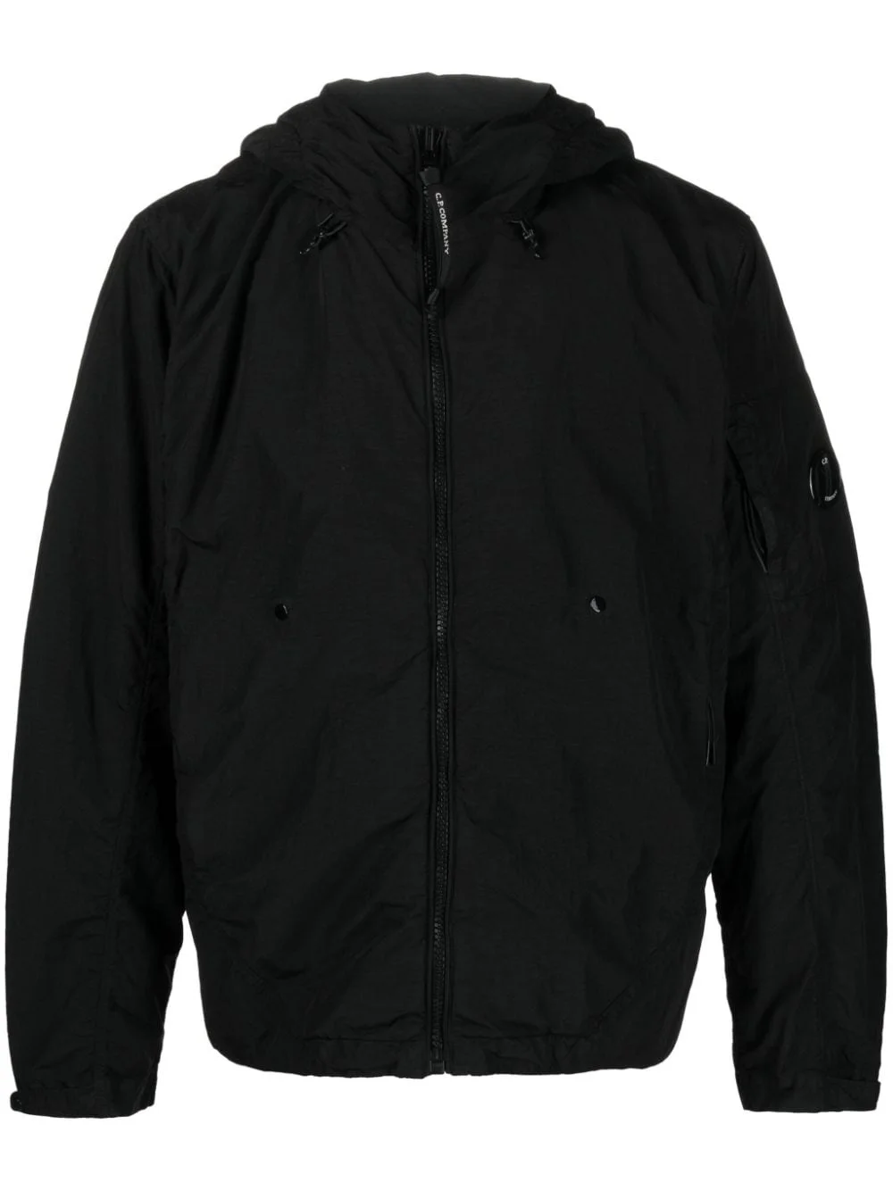 Flatt Nylon hooded jacket Highlights - Black - Tonal design - Signature lens detail - Stud detailing - Drawstring hood - High neck - Front zip fastening - Long sleeves - Sleeve zip pocket - Press-stud fastening cuffs - Two side zip-fastening pockets - Partial mesh lining - Internal signature lens detail - Locker loop - Multiple internal cargo pockets - Internal adjustable shoulder straps - Straight hem - C.p. company suggests removing any detachable accessories before washing. Imported Composition Lining: Polyamide 100% Outer: Polyester 100%, Polyamide 100% Washing instructions Machine Wash