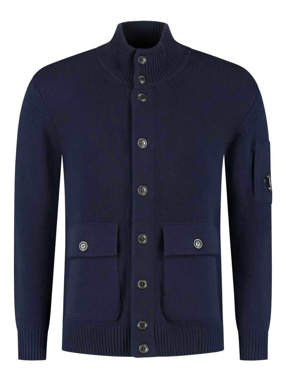 high-neck buttoned cardigan Highlights - Navy blue - High neck - Button fastening - Flap pockets - Ribbed hem - Signature lens detail - C.p. company suggests removing any detachable accessories before washing. Imported Composition Body: Wool 80%, Polyamide 20% Washing instructions Hand Wash
