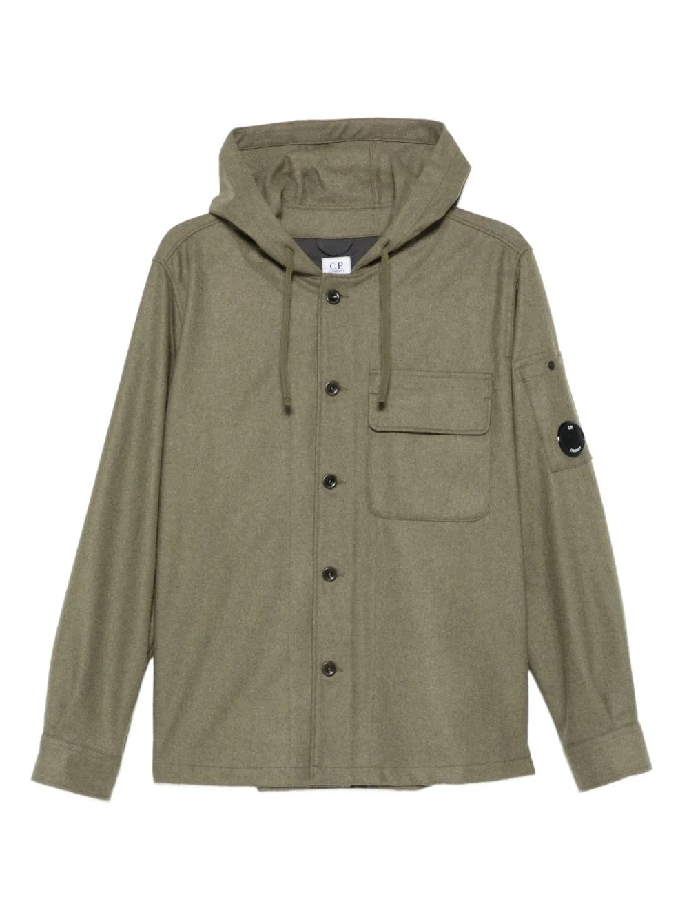 hooded buttoned jacket Highlights - Olive green - Hooded - Button fastening - Patch pocket - Long sleeves - Lens detail - C.p. company suggests removing any detachable accessories before washing. Imported Composition Wool 80%, Polyamide 20% Washing instructions Read Manufacturer Guidelines
