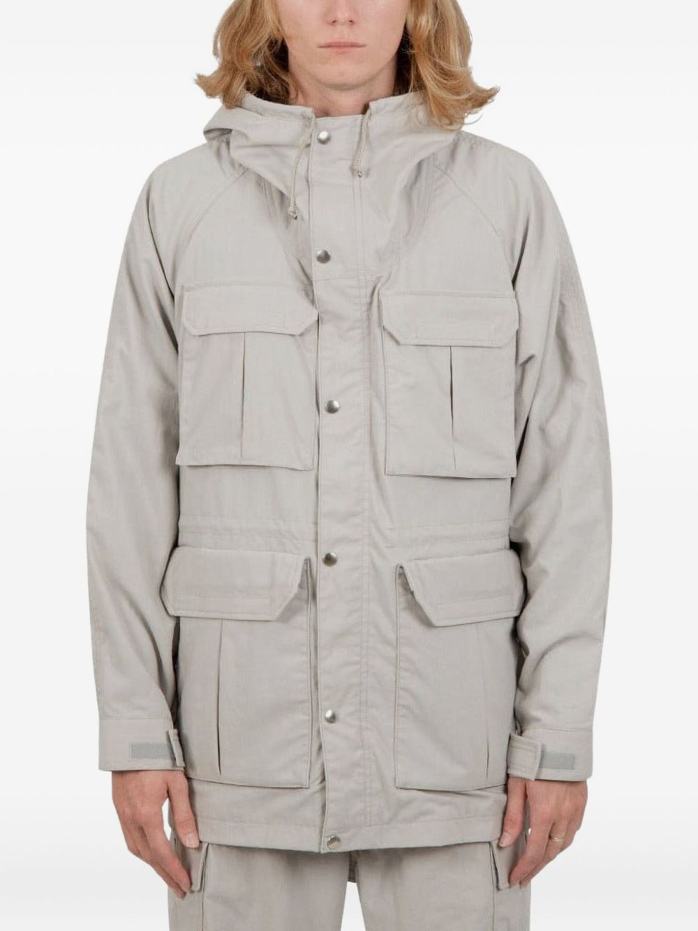 hooded multi-pocket jacket Highlights - Light grey - Drawstring waist - Multiple pockets - Snap button fastening - Hooded neckline - Long sleeves Imported Composition Nylon 100% Washing instructions Read Manufacturer Guidelines