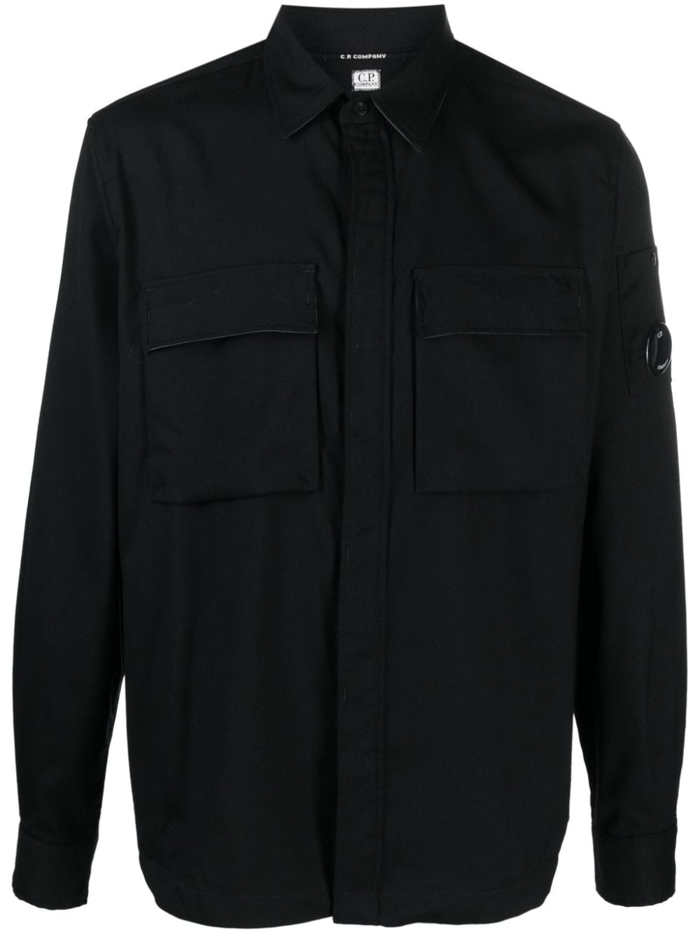 Lens-detail button-up shirt Highlights - Black - Signature lens detail - Straight-point collar - Concealed front button fastening - Long sleeves - Buttoned cuffs - Sleeve patch pocket - Two chest flap pockets - Straight hem - C.p. company suggests removing any detachable accessories before washing. Made in Italy Composition Polyester 55%, Wool 44%, Elastane 1% SIZE & FIT Model measurements Height 6 ft 2 in(1.88 m) Bust/Chest 34.64 in(88 cm) Hips 33.85 in(86 cm) Waist 27.55 in(70 cm) Washing instructions Machine Wash