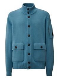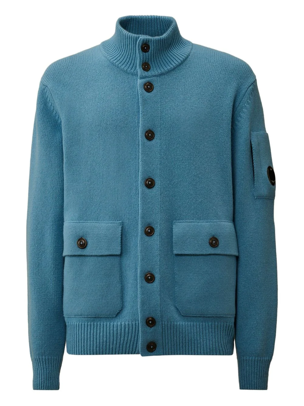 Lens-detail buttoned cardigan Highlights - Blue - Wool blend - Button fastening - Flap pockets - Long sleeves - Signature lens detail - High neck - C.p. company suggests removing any detachable accessories before washing. Imported Composition Body: Wool 80%, Polyamide 20% Washing instructions Read Manufacturer Guidelines