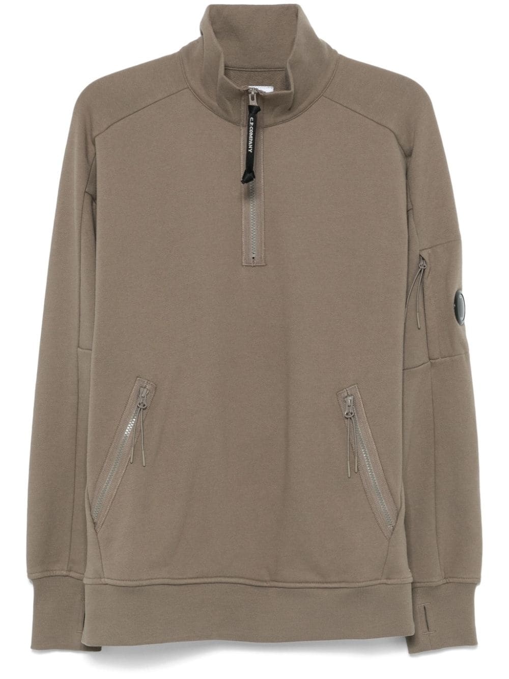 Lens-detail sweatshirt Highlights - Olive green - Cotton - Jersey texture - Signature lens detail - Short front zip fastening - High neck - Drop shoulder - Long sleeves - Ribbed cuffs and hem - Thumb slots - Sleeve zip pocket - Two side zip-fastening pockets - Fleece lining - Straight hem Imported Composition Cotton 100% SIZE & FIT Model measurements Height 6 ft 2 in(1.88 m) Bust/Chest 36.61 in(93 cm) Hips 35.82 in(91 cm) Waist 27.95 in(71 cm) FittingInformation Designed for a regular fit, offering a comfortable loose fit throughout the body Made from a midweight non-stretch fabric, this piece offers minimal elasticity when worn
