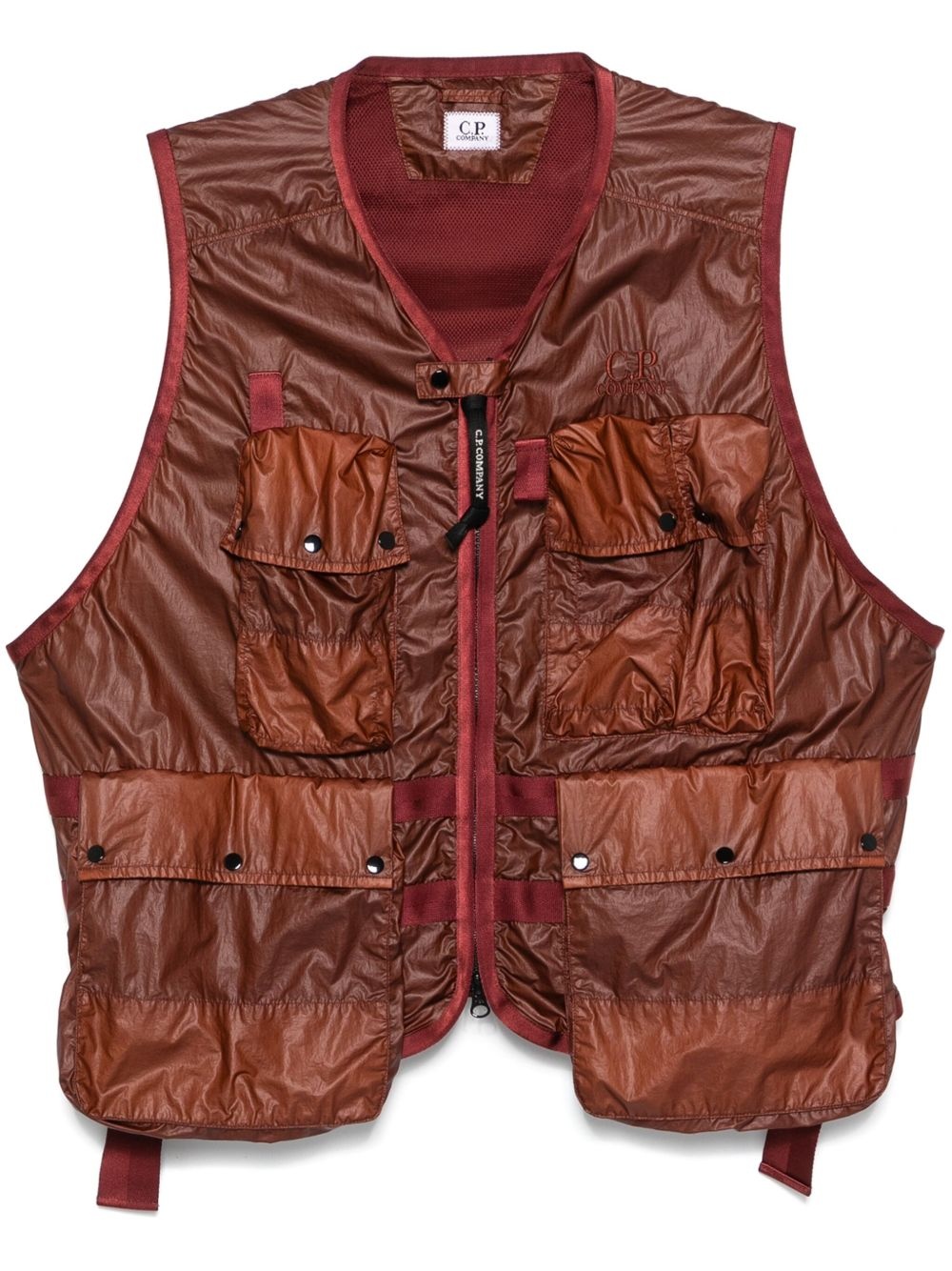shell gilet Highlights - Rust brown - Front two-way zip fastening - Press-stud fastening - Multiple patch pockets - C.p. company suggests removing any detachable accessories before washing. Imported Composition Outer: Polyamide 100%, Polyurethane Resin 100% Lining: Polyamide 100% SIZE & FIT Model measurements Height 6 ft 1 in(1.86 m) Bust/Chest 37.4 in(95 cm) Hips 36.22 in(92 cm) Waist 29.52 in(75 cm) FittingInformation Designed for a regular fit, allowing for a comfortably loose fit throughout the body The adjustable tabs allow for fitted preferences Made from a midweight non-stretch fabric Washing instructions Machine Wash