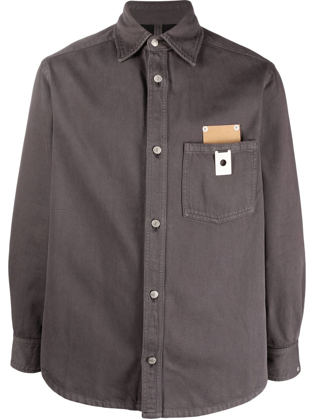 denim long-sleeved shirt charcoal grey cotton frayed detailing chest patch pocket classic collar front button fastening long sleeves curved hem Imported Composition Cotton 100% SIZE & FIT Model measurements Height 6 ft 2 in(1.88 m) Bust/Chest 36.61 in(93 cm) Hips 37.79 in(96 cm) Waist 28.74 in(73 cm) FittingInformation This piece fits true to size. We recommend you get your regular size Cut for a loose fit Made with a mid-weight non-stretch fabric Washing instructions Machine Wash