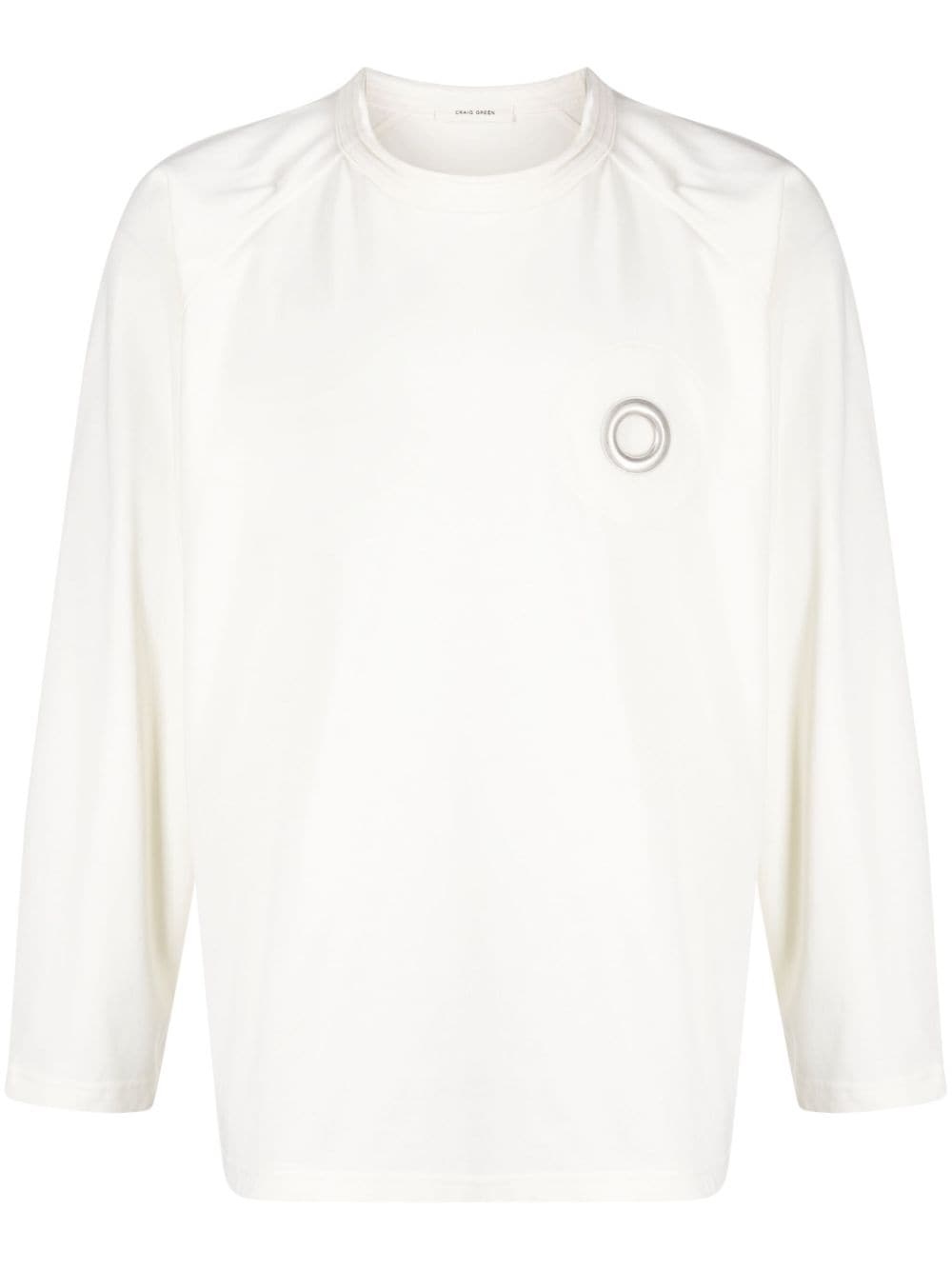 long-sleeve cotton T-shirt Highlights - Cream white - Cotton - Silver-tone stud detailing - Round neck - Long sleeves - Straight hem Made in Italy Composition Body: Cotton 100% SIZE & FIT Model measurements Height 6 ft 2 in(1.87 m) Bust/Chest 31.49 in(80 cm) Hips 37.79 in(96 cm) Waist 27.95 in(71 cm) FittingInformation Designed to be unstructured, offering a loose fit throughout Made from a midweight non-stretch fabric, this piece offers minimal elasticity when worn This piece fits true to size – take your usual size Washing instructions Hand Wash