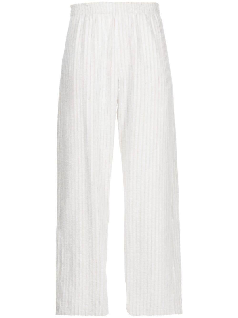 striped straight-leg trousers Highlights - Cloud white - Cotton - Stripe print - Frayed detailing - Elasticated waistband - Two side inset pockets - Straight leg - Straight hem Imported Composition Cotton 100% SIZE & FIT Model measurements Height 6 ft 2 in(1.89 m) Bust/Chest 37.4 in(95 cm) Hips 36.61 in(93 cm) Waist 28.34 in(72 cm) FittingInformation Designed for a straight-leg, allowing for an unrestricted and comfortable fit over the leg Adjust this piece’s waistband to your preference using the drawstring Made from a midweight non-stretch fabric This piece fits true to size – take your usual size Washing instructions Dry Clean Only