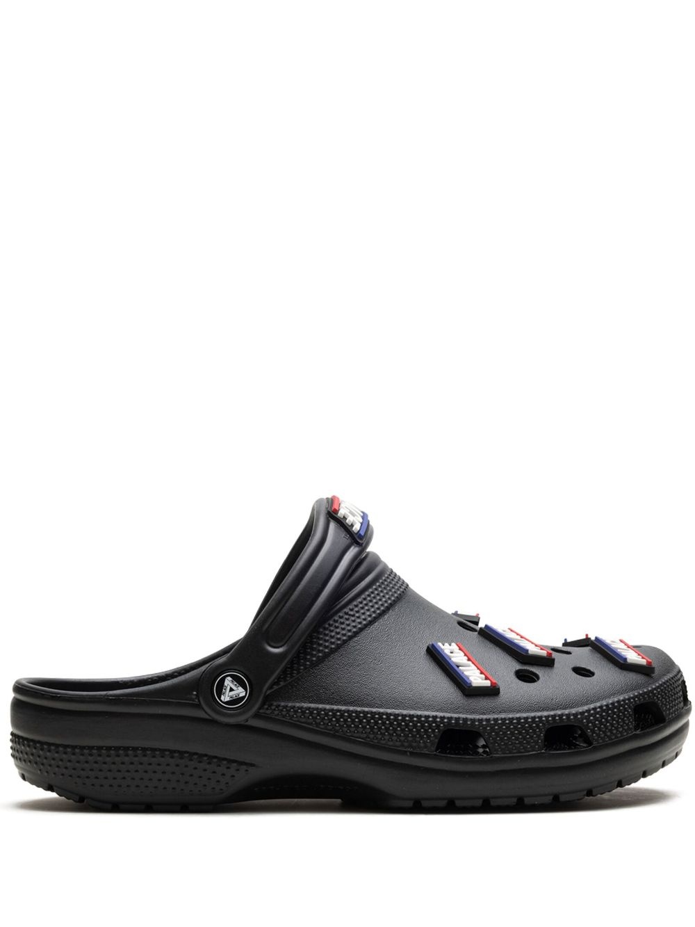 x Palace Classic clogs These Palace Skateboards x Crocs Classic clogs boast a sleek and simple black design. The Palace logo is prominently displayed on the strap and footbed, while a range of custom Jibbitz charms decorate the top. Highlights - Black - Signature tri-ferg logo - Applique detailing - Cut-out detailing - Round toe - Slingback strap - Rubber sole Imported Composition Sole: Rubber 100% Lining: Polyethylene vinyl acetate (PEVA) 100% Outer: Polyethylene vinyl acetate (PEVA) 100%