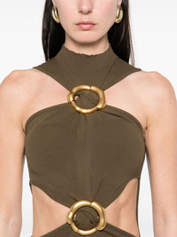 Ambar midi dress Highlights - Olive green - High neck - Cut-out detailing - Ring hardware detailing Imported Composition Viscose 60%, Nylon 40% SIZE & FIT Model measurements Height 5 ft 10 in(1.78 m) Bust/Chest 33.46 in(85 cm) Hips 36.22 in(92 cm) Waist 23.22 in(59 cm) FittingInformation Designed for a close fit throughout Made with a midweight knit, this piece offers some stretch Washing instructions Dry Clean Only