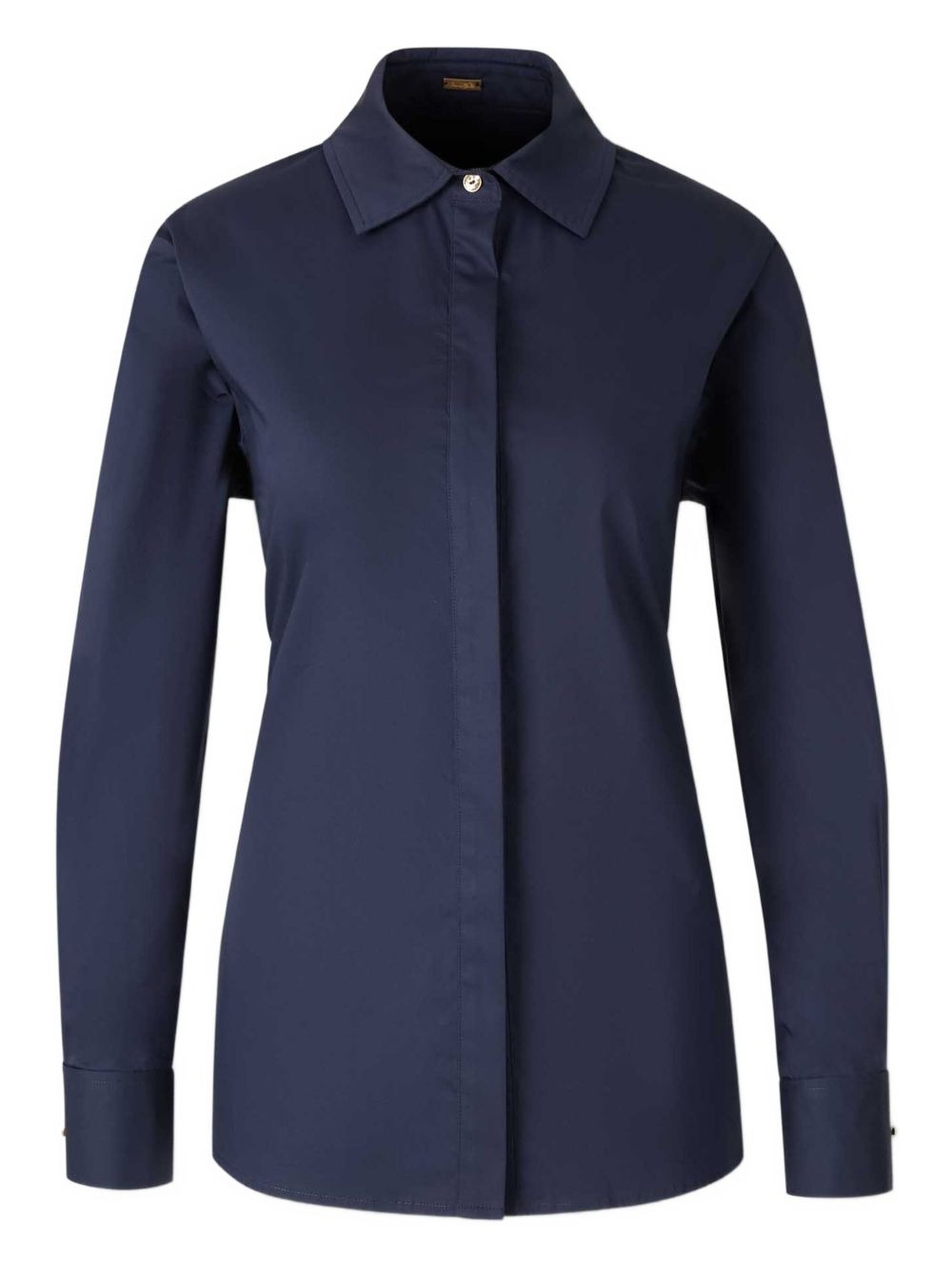 button-fastening open-back blouse Highlights - Navy blue - Classic collar - Long sleeves - Button cuffs - Open back - Buckle straps Imported Composition Cotton 65%, Nylon 29%, Elastane 6% Washing instructions Read Manufacturer Guidelines