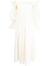 cold-shoulder ruffle-sleeve dress Highlights - Cold-shoulder ruffle-sleeve dress from cult gaia featuring off-white, cotton-linen blend, off-shoulder, ruffled detailing, long sleeves, ruffle cuffs and mid-length. . Imported Composition Linen/Flax 100% SIZE & FIT Model measurements Height 5 ft 10 in(1.78 m) Bust/Chest 31.49 in(80 cm) Hips 36.22 in(92 cm) Waist 25.59 in(65 cm) Measurement SLEEVE LENGTH 19.01 in(48.3 cm) HIPS 34.01 in(86.4 cm) LENGTH 42.51 in(108 cm) WAIST 25.98 in(66 cm) BUST 25.98 in(66 cm) FittingInformation This piece fits true to size. We recommend you get your regular size Designed for a close fit at the bust, waist and hips Made with a mid-weight fabric Washing instructions Dry Clean Only