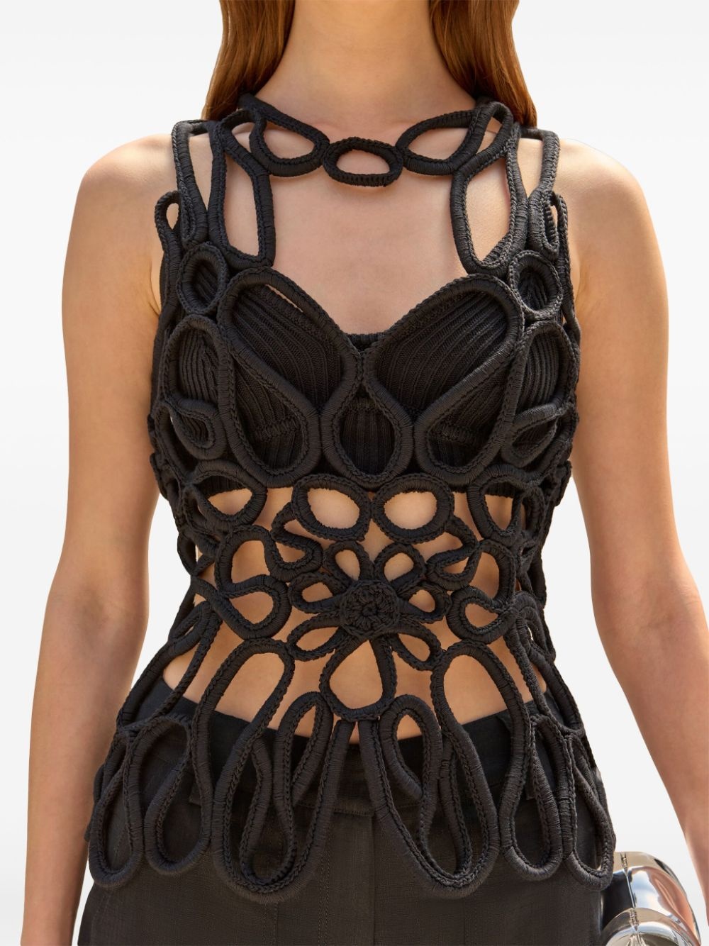 Danica knitted top Highlights - Black - Cotton - Crochet knit - Open knit - Layered design - Floral motif - Round neck - Sleeveless - Scallop hem Imported Composition Cotton 100%