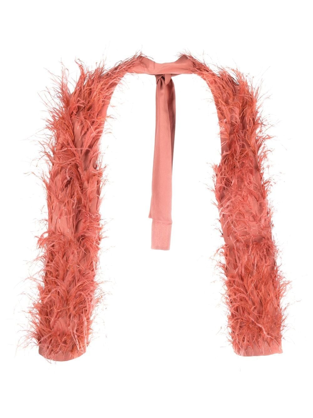 feather-embellished bolero coral pink feather detailing rear tie fastening open front backless long sleeves Imported Composition Feather 100% SIZE & FIT Model measurements Height 5 ft 10 in(1.78 m) Bust/Chest 33.07 in(84 cm) Hips 36.61 in(93 cm) Waist 24.8 in(63 cm) FittingInformation This piece fits true to size. We recommend you get your regular size Cut for a close fit Made with a mid-weight non-stretch fabric Washing instructions Dry Clean Only