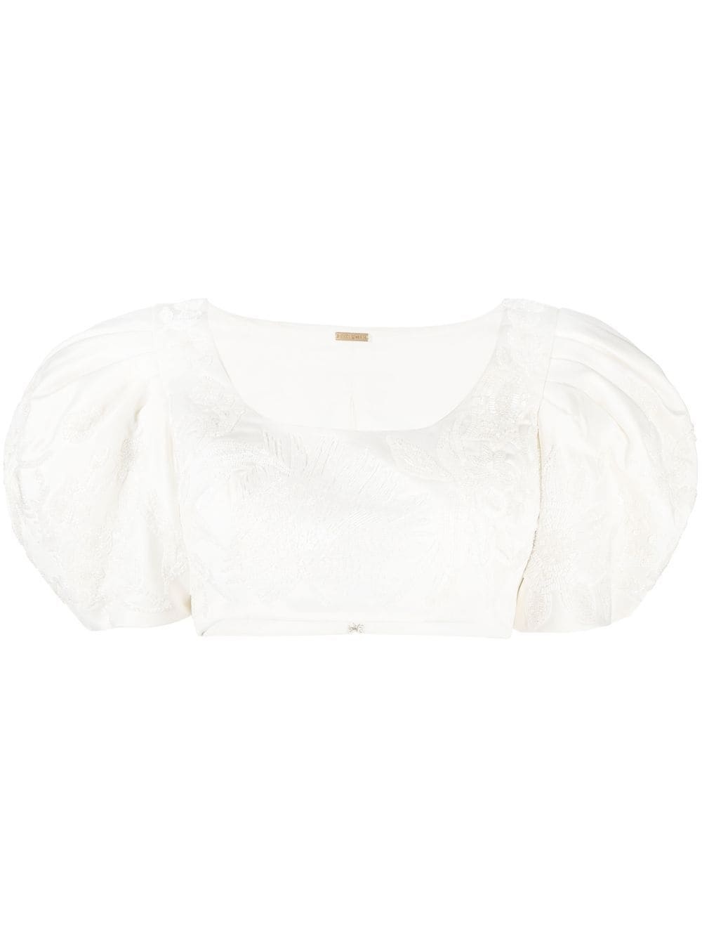 floral-embroidery cropped top ivory white all-over floral embroidery scoop neck short puff sleeves concealed rear zip fastening cropped Imported Composition Polyester 100% SIZE & FIT Model measurements Height 5 ft 11 in(1.8 m) Bust/Chest 31.49 in(80 cm) Hips 36.61 in(93 cm) Waist 24.4 in(62 cm) FittingInformation This piece fits true to size. We recommend you get your regular size Cut for a slim fit Made with a mid-weight non-stretch fabric Washing instructions Dry Clean Only