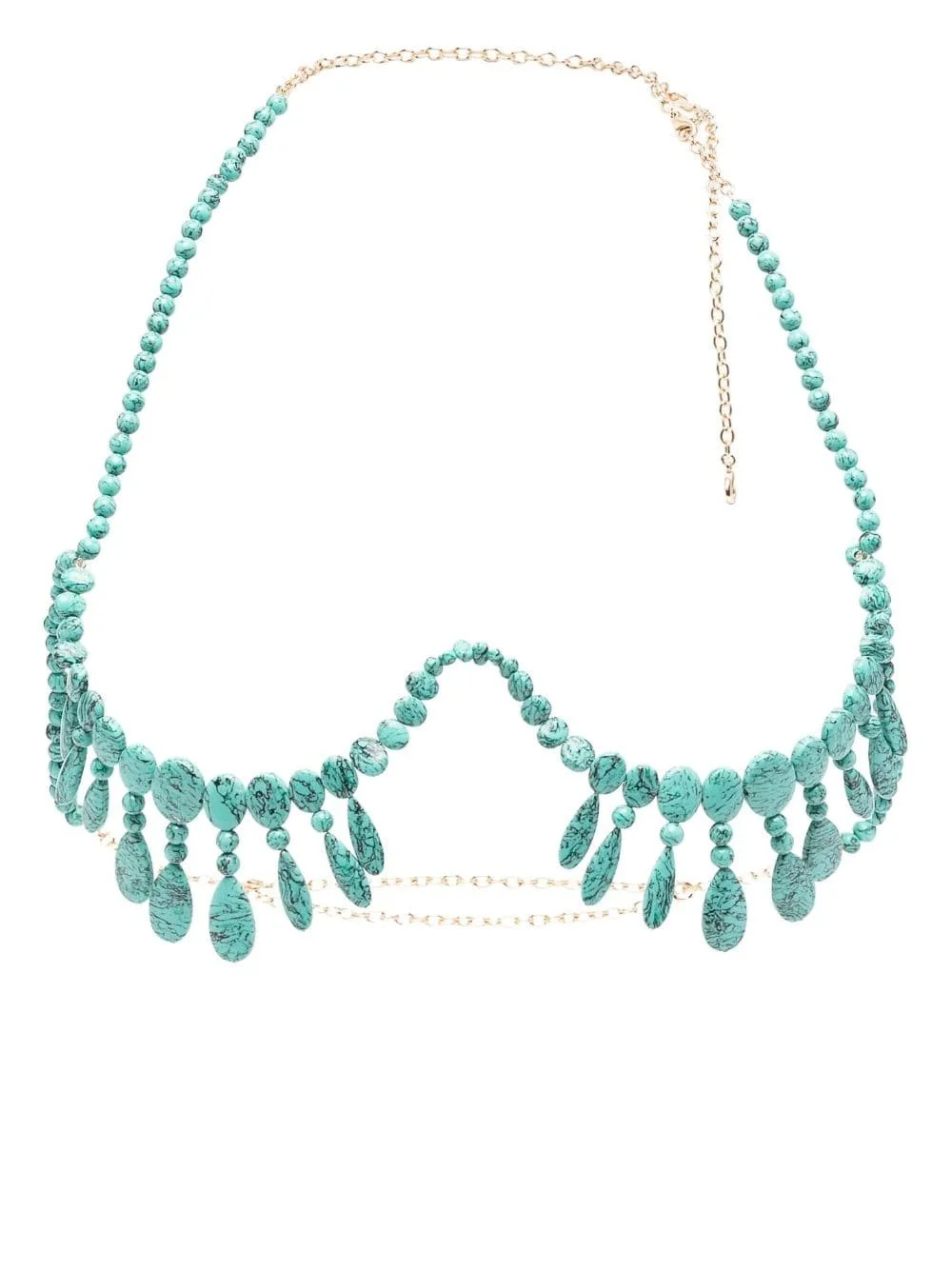 Gabrie beaded bralette Highlights - Turquoise blue-green - Bead embellishment - Bustier-style neckline - Halterneck tie fastening - Adjustable-length chain - Lobster claw fastening Imported SIZE & FIT Model measurements Height 5 ft 11 in(1.8 m) Bust/Chest 31.49 in(80 cm) Hips 36.22 in(92 cm) Waist 25.59 in(65 cm) Measurement Length when open 41.33 in(105 cm) Minimum Length 33.46 in(85 cm) PENDANT LENGTH 11.81 in(30 cm) PENDANT WIDTH 2.55 in(6.5 cm) WIDTH 0.31 in(0.8 cm)