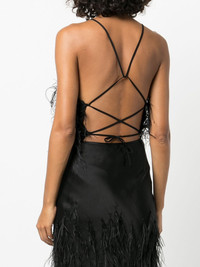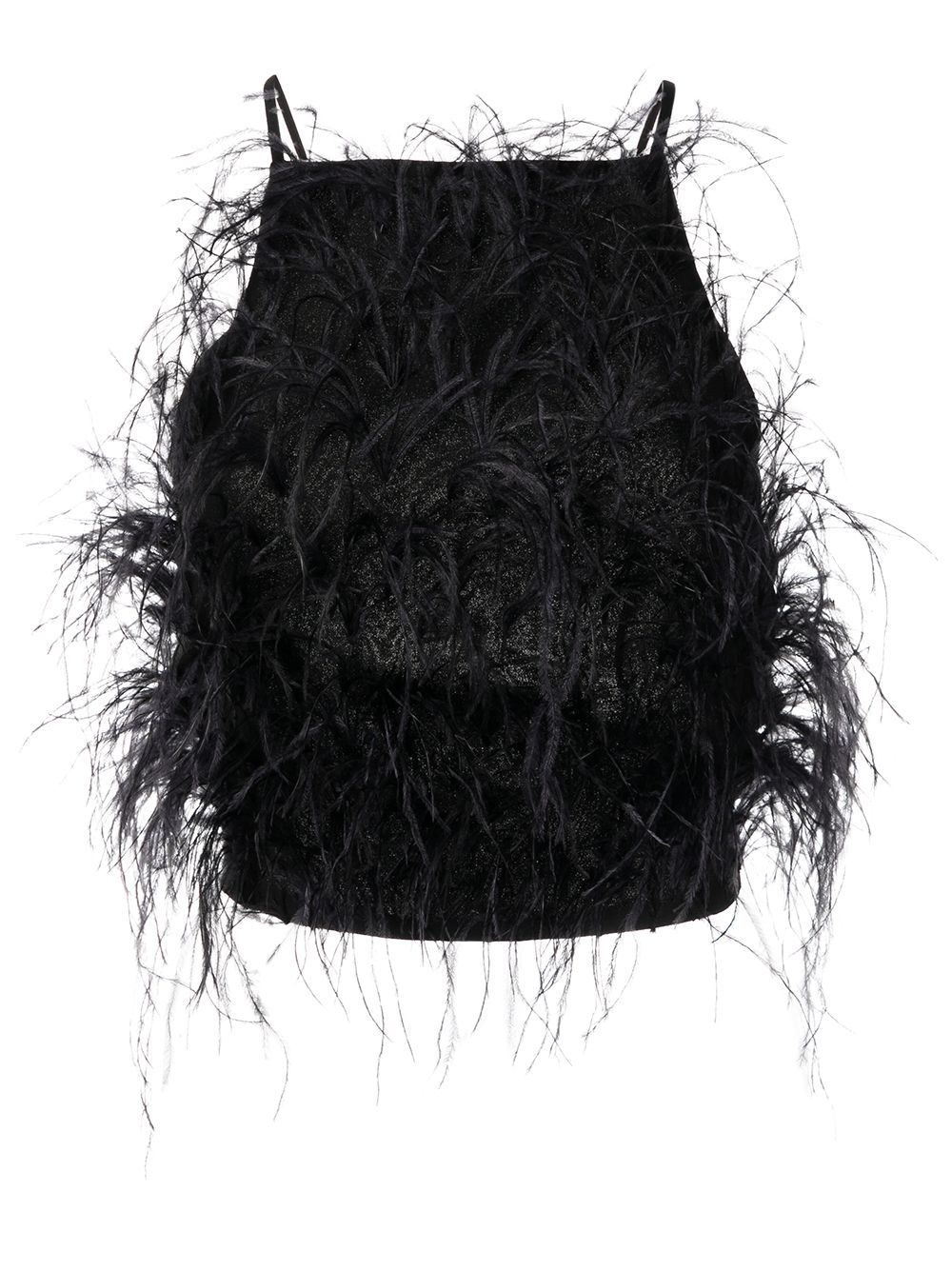 Joey ostrich feather blouse black feather detailing square neck sleeveless crossover strap detail Imported Composition Body: Ostrich Feather 100%, Viscose 100% SIZE & FIT Model measurements Height 5 ft 10 in(1.77 m) Bust/Chest 31.88 in(81 cm) Hips 34.64 in(88 cm) Waist 24.01 in(61 cm) FittingInformation This piece fits true to size. We recommend you get your regular size Cut for a close fit Made with a lightweight non-stretch fabric