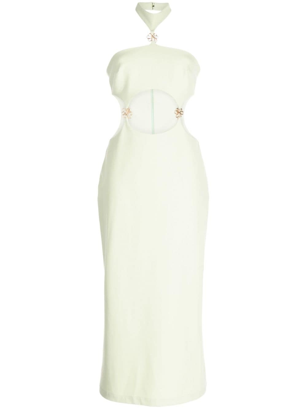 Olivia halterneck cut-out dress Cult Gaia’s vision to ‘create a wardrobe full of magic’ is brought to life with this Olivia dress. The crepe construction plays host to graphic cut-outs secured by flower-shaped gold-tone charms. Highlights - Light green - Crepe texture - Cut-out detailing - Gold-tone hardware - Halterneck - Rear zip fastening - Sleeveless - Calf-length Imported Composition Body: Polyester 100% SIZE & FIT Model measurements Height 5 ft 10 in(1.77 m) Bust/Chest 31.88 in(81 cm) Hips 33.85 in(86 cm) Waist 24.01 in(61 cm) FittingInformation Designed for a slim fit that sits just away from the body offering a close yet comfortable fit Made from a midweight stretch fabric, this piece offers elasticity and flexibility when worn This piece fits true to size – take your usual size Washing instructions Dry Clean Only