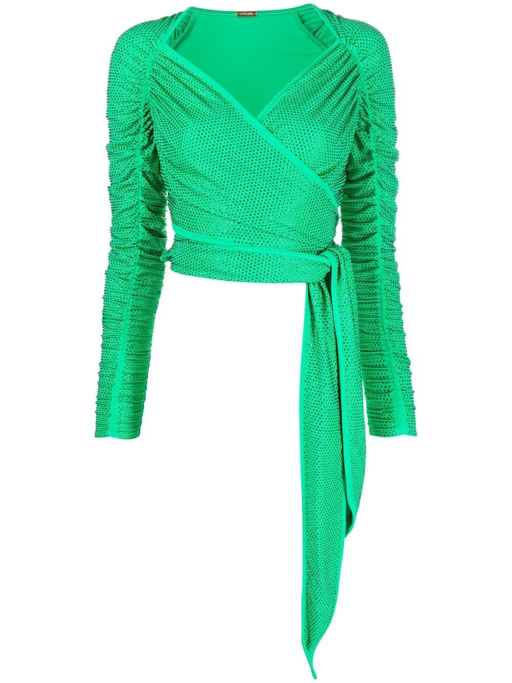 Paislee embellished top vine green stretch-design jersey knit rhinestone embellishment gathered detailing wrap design V-neck long sleeves cropped Imported Composition Nylon 100% SIZE & FIT Model measurements Height 5 ft 10 in(1.78 m) Bust/Chest 33.07 in(84 cm) Hips 35.82 in(91 cm) Waist 25.98 in(66 cm) FittingInformation This piece fits true to size. We recommend you get your regular size Cut for a slim fit Made with a mid-weight stretch fabric Washing instructions Dry Clean Only