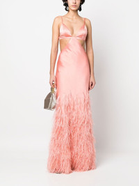 Raisa feather-trim gown Azalea pink silk satin weave feather-trim detailing cut-out detailing V-neck rear hook and eye fastening concealed side zip fastening spaghetti straps elasticated strap flared hem floor-length Imported Composition Outer: Feather 100%, Silk 100% Lining: Polyester 100% SIZE & FIT Model measurements Height 5 ft 10 in(1.78 m) Bust/Chest 33.07 in(84 cm) Hips 35.82 in(91 cm) Waist 25.98 in(66 cm) FittingInformation This piece fits true to size. We recommend you get your regular size Designed for a close fit at the bust, waist and hips Made with a mid-weight non-stretch fabric Washing instructions Dry Clean Only