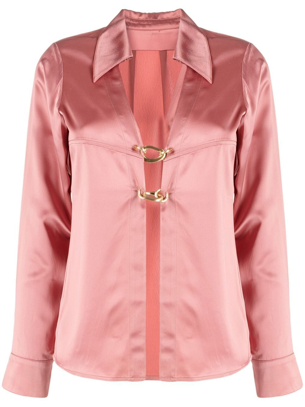 Yoona satin link shirt Constructed in luxe Naia satin, Cult Gaia presents the Yoona shirt in a warm pink hue. The garment is defined by the gold-toned links featured at the front for a sleek contemporary look. Imported Composition Body: NAIA™ Cellulosic Fiber 79%, Polyester 21% SIZE & FIT Model measurements Height 5 ft 11 in(1.8 m) Bust/Chest 28.34 in(72 cm) Hips 35.43 in(90 cm) Waist 23.62 in(60 cm) FittingInformation This piece fits true to size. We recommend you get your regular size Cut for a loose fit Made with a lightweight non-stretch fabric Washing instructions Read Manufacturer Guidelines