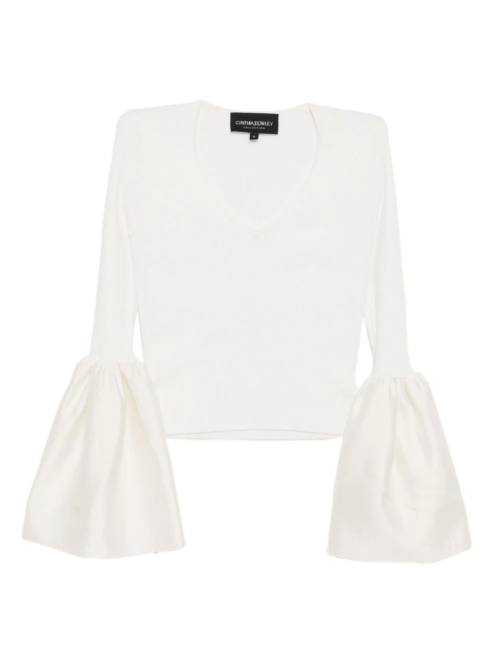 flared-sleeves top Highlights - White - Long sleeves - V-neck Imported Composition Silk 25%, Wool 25%, Polyamide 25%, Viscose 25% SIZE & FIT Model measurements Height 5 ft 10 in(1.77 m) Bust/Chest 29.33 in(74.5 cm) Hips 32.28 in(82 cm) Waist 24.01 in(61 cm) FittingInformation Designed for a close fit at the chest and waist with a loose fit at the hip Made from a midweight non-stretch fabric Washing instructions Dry Clean Only